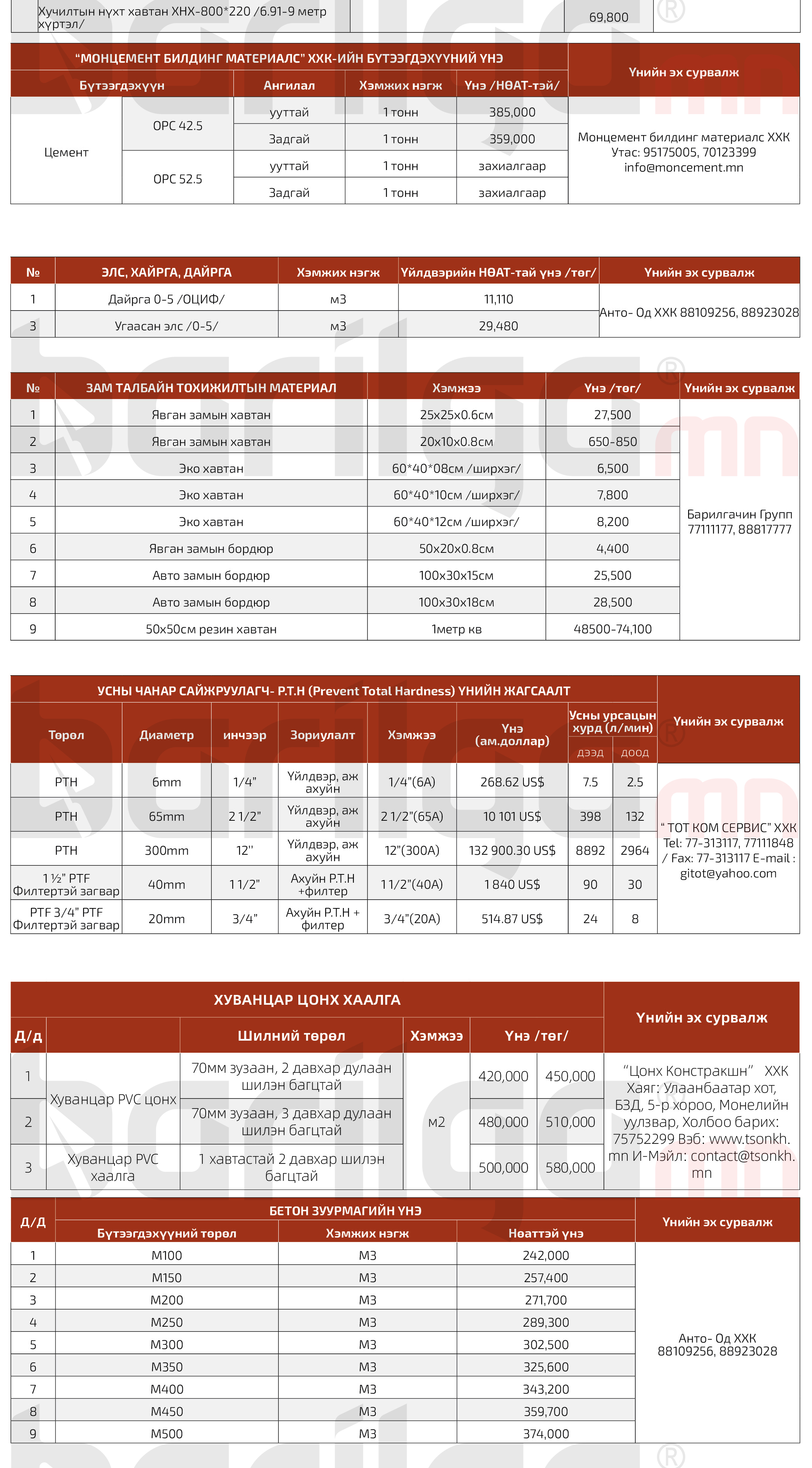 Дараах барилгын материалын үнэд НӨАТ орсон, тээврийн зардал ороогүй болно