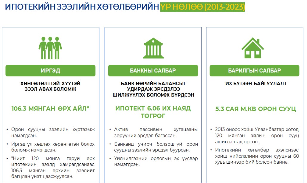 Ипотекийн хөтөлбөрийн нийт санхүүжилтийн 80 хувийг Монголбанк, 20 хувийг банкууд өөрийн эх үүсвэрээр 2022 оны 10 дугаар сараас эхлэн санхүүжүүлж, иргэдэд 6% хүүтэй орон сууцны зээл олгож байна. Өмнө нь энэ харьцаа 60/40 байсан.