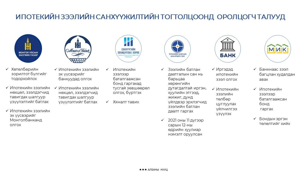 Монгол Улсын засгийн газар, Монголбанк, Санхүүгийн зохицуулах хороо, Зээлийн батлан даалтын сан, арилжааны банкууд, МИК гэсэн оролцогч талууд байдаг. Оролцогч бүр өөр өөрсдийн үүрэг, хариуцах ажилтай байдаг. Тухайлбал Засгийн газар болон Монгол банкнаас ипотекийн зээлийн журам, зээлийн хүү, шалгуур үзүүлэлтүүдийг гаргаж, бодлогыг тодорхойлдог.