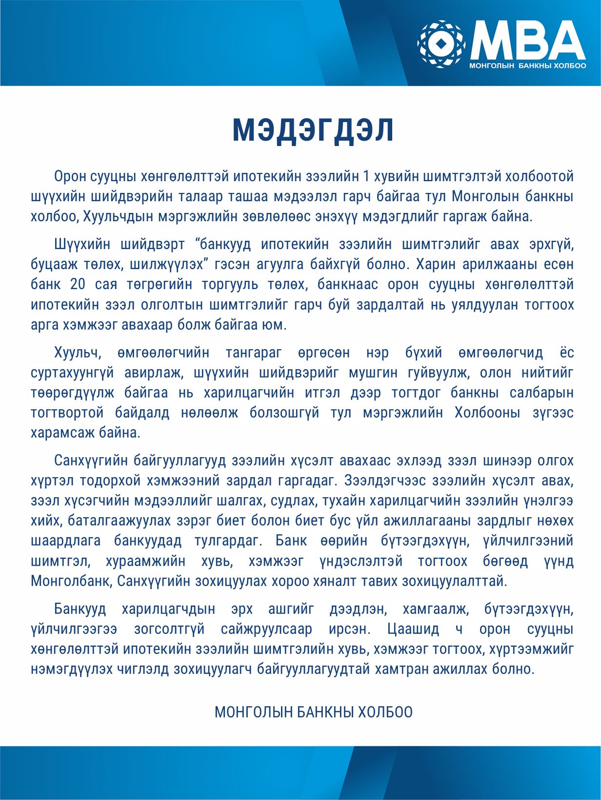 Орон сууцны санхүүжилтийн тогтолцооны хүрээнд ипотекийн зээлийн нөхцөлүүд, шалгуур үзүүлэлтүүдийг Засгийн газар болон Монгол банкнаас тогтоодог. Ипотекийн зээл олголтын хүрээнд арилжааны банкууд зээл авч буй иргэдээс зээл судалсны нэг хувийн шимтгэл авдаг. Энэ нь хууль бус үйлдэл бөгөөд иргэдийн данс руу нэг хувийн шимтгэлийг банкууд буцаан хийх ёстой гэж улсын дээд шүүх тогтоолоо гэсэн мэдээллийг хуульч О.Батхүү өөрийн цахим хуудсаар дамжуулан олон нийтэд мэдэгдсэн. Энэ мэдэгдлийн дагуу иргэд ипотекийн зээлийн нэг хувийн шимтгэл буцаан олгогдоно гэсэн ойлголттой байсан юм. Гэтэл Монголын банкны холбооноос тус ойлголтыг няцаасан мэдэгдэл гаргажээ. Тус мэдэгдэлд “Шүүхийн шийдвэрт банкууд ипотекийн зээлийн шимтгэлийг авах эрхгүй, буцааж төлөх, шилжүүлэх гэсэн агуулга байхгүй болно. Харин арилжааны есөн банк 20 сая төгрөгийн торгууль төлөх, банкнаас орон сууцны хөнгөлттэй ипотекийн зээл олголтын шимтгэлийг гарч буй зардалтай нь уялдуулан тогтоох арга хэмжээг авахаар болж байгаа юм. Гэтэл хуульч, өмгөөлөгчийн тангараг өргөсөн нэр бүхий өмгөөлөгчид ёс суртахуунгүй авирлаж, шүүхийн шийдвэрийг мушгин гуйвуулж, олон нийтийг төөрөгдүүлж байгаа нь харилцагчийн итгэл дээр тогтдог банкны салбарын тогтвортой байдалд нөлөөлж болзошгүй тул мэргэжлийн Холбооны зүгээс харамсаж байна” хэмээжээ.