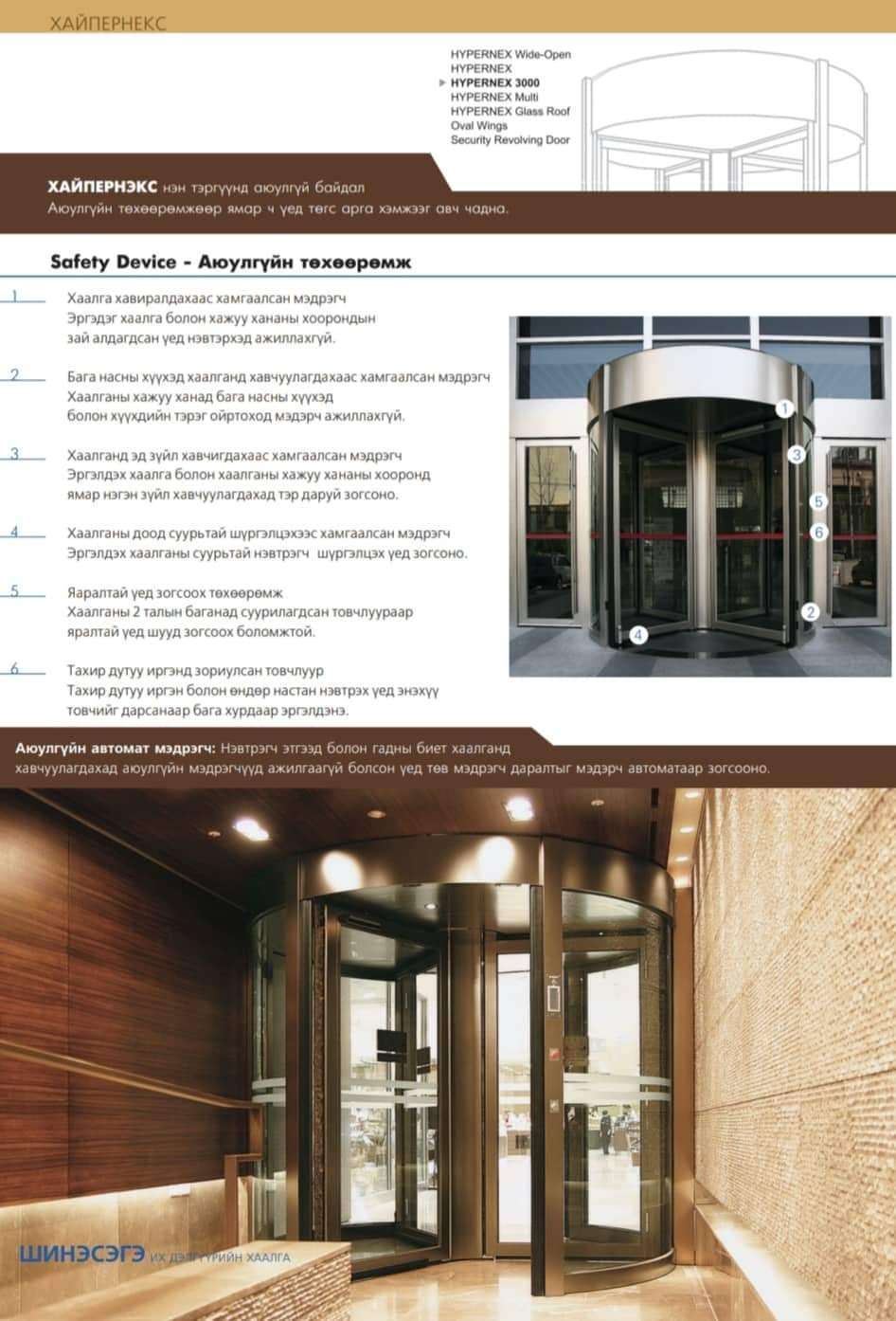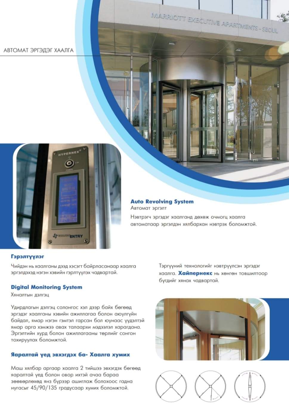 Тус автомат хаалга нь оффис, эмнэлэг, дэлгүүр, банк, үйлчилгээний төвүүдэд маш тохиромжтой бөгөөд өнгөний сонголттой, үзэмж сайтай, мэдрэгч, пуш дарах, карт унших, нууц дугаар хийх, домопон холбох тог тасарсан үед механик болж батериагаар ажиллах зэрэг олон давуу талтай юм. Түүнчлэн нэг жилийн баталгаа өгөхийн зэрэгцээ ямар нэгэн эвдрэл гарах болон дуудлага өгсөн тохиолдолд түргэн шуурхай очиж үйлчилгээ үзүүлнэ.