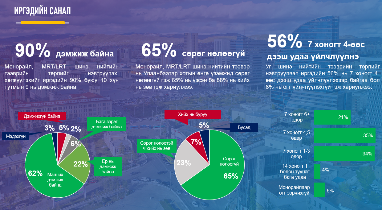 Мөн иргэдээс түгжрэлийг бууруулах чиглэлээр ямар ажил хийвэл үр дүнтэй талаар асуухад хамгийн их дэмжлэг авсан нь гэрийн ойролцоо сургууль, цэцэрлэг шинээр барьж, хүрэлцээг нэмэгдүүлэх хэрэгтэй гэх санал байсан. Үүний дараа томоохон зах, худалдааны төвүүдийг дэд төвүүдэд тархаан байршуулах, метро болон их багтаамжийн нийтийн тээврийн хэрэгслийг нэвтрүүлэх, нийтийн тээврийн парк шинэчлэл, ухаалаг гэрлэн дохионы зохицуулалт гэж санал өгсний дагуу нийслэлийн удирдлагууд судалгаан дээр үндэслэн ажиллаж байна. Иргэдийн 90 хувь нь багтаамж ихтэй нийтийн тээврийн хэрэгсэл, тэр дундаа метрог дэмжиж байгаа судалгаа гарсан юм.