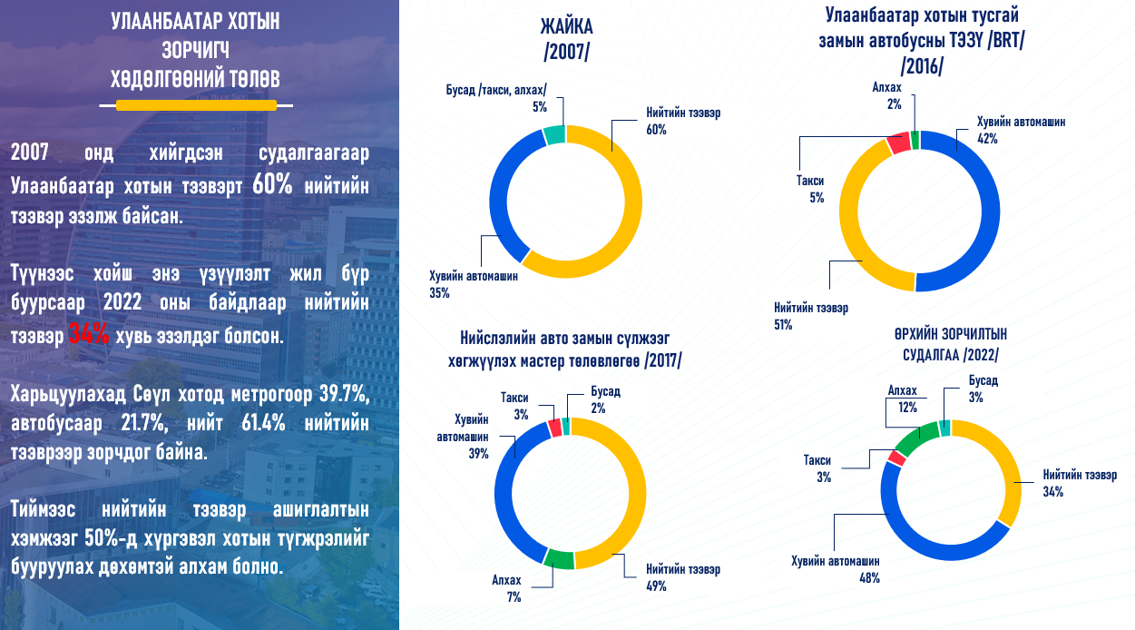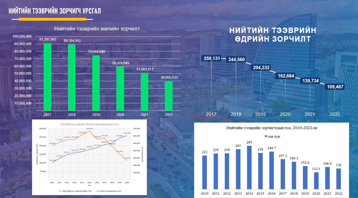 2007 онд хийсэн ЖАЙКА олон улсын байгууллагын судалгаагаар улаанбаатарчуудын 60 хувь нь нийтийн тээврээр зорчиж байсан. Тэгвэл өдгөө энэ тоо 30 хувьд хүрэхгүй байгаа юм. Энэ нь нийтийн тээврийн шинэчлэлийг цаг алдалгүй хийх шаардлагатай болсныг харуулж байна. Дэлхийн томоохон хотуудад иргэдийнх нь 60 хувь нь нийтийн тээврээр зорчдог. Гэтэл манайд иргэдийн 50 гаруй хувь нь хувийн тээврийн хэрэгслээр зорчиж байна. Нийтийн тээврээр зорчих иргэдийн тоо жил ирэх тусам буурч буй.