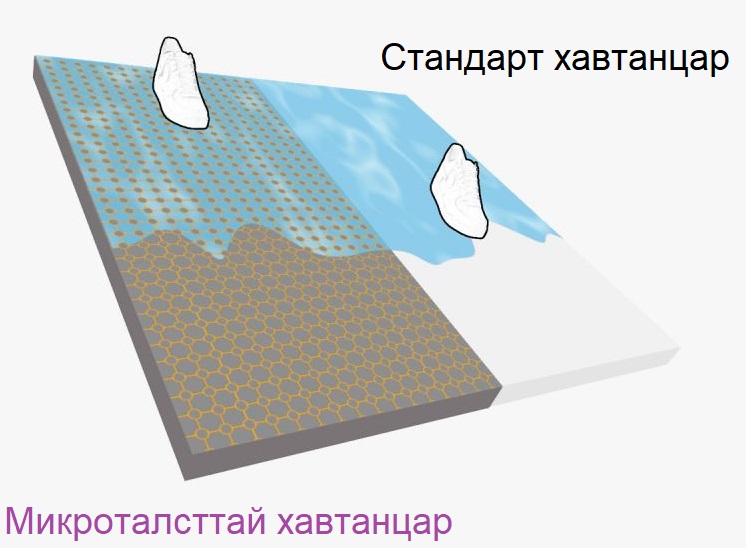 Стандарт плитаны гадаргуу дээр ус асгарахад усны молекулууд хоорондоо холбогдож мөн гадаргууд суудаг байна. Тэгвэл микроталстууд нь эдгээр холбоог тасалснаар гулсалт үүсэхгүй болдог ажээ.