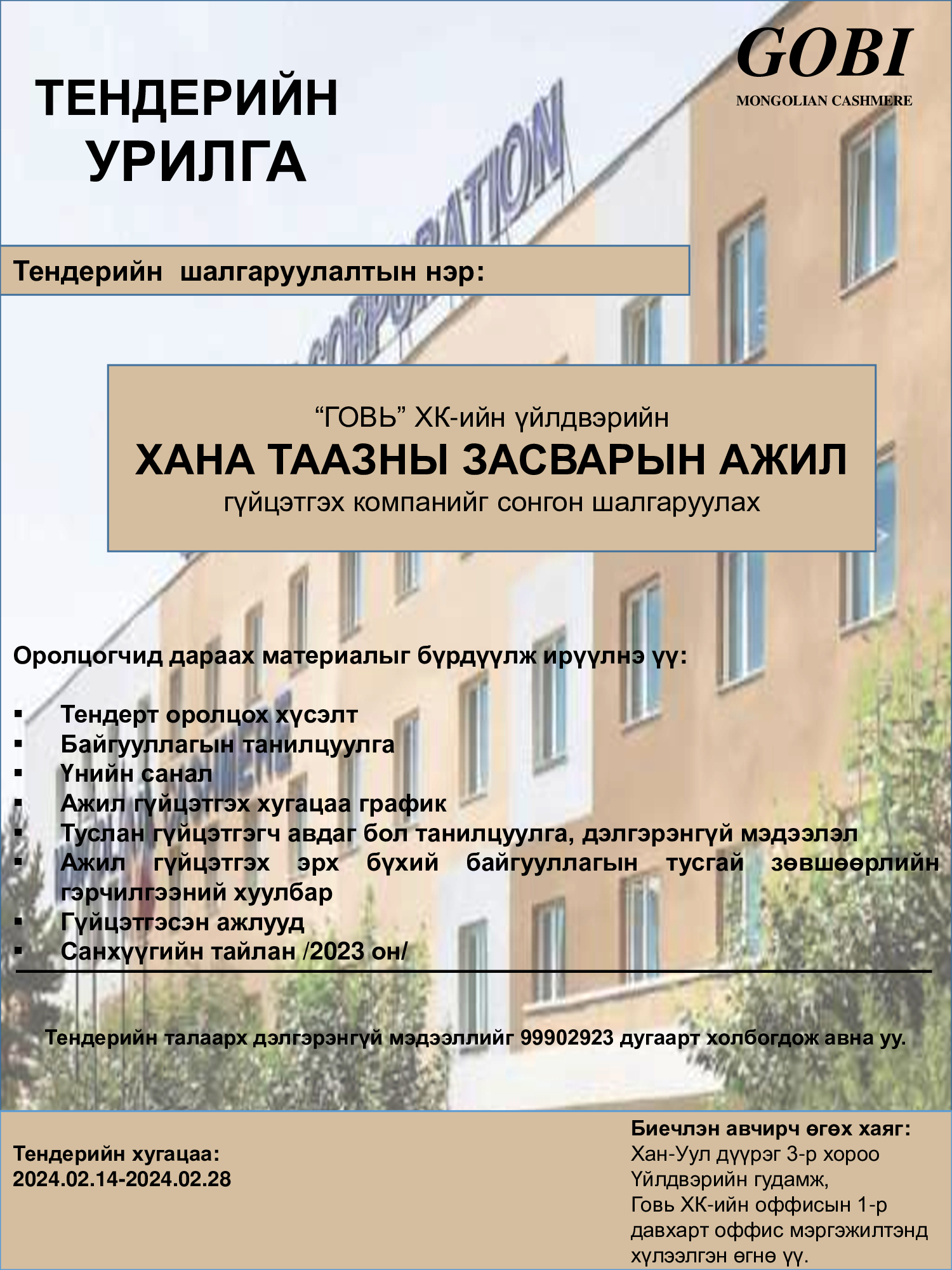 Говь ХК-ийн үйлдвэрийн байрны хана таазны засварын ажил гүйцэтгэх компанийг сонгон шалгаруулах тендерт урьж байна.