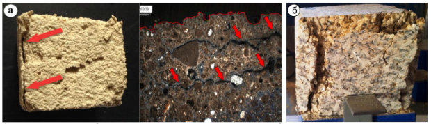 Зураг 5. Хөлдөлт ба гэсэлтийн үр дүнд шавар эдлэл, боржин чулуунд үүсэх гэмтэл. a) Гадаргуу хуурч буй болон цууралт үүссэн байдал, б) Боржин чулууны гэмтсэн байдал