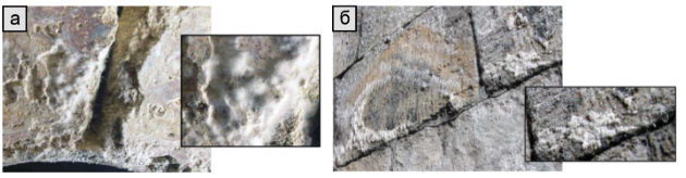 Зураг 4. Чулуун дурсгал дээр үүсэж буй зарим гэмтэл. a) Хөгц ургасан байдал, б) Давсны талсжилтын үзэгдэл, в) Бичил цуурлууд үүссэн байдал, г) Гадаргуу хуурч унасан байдал