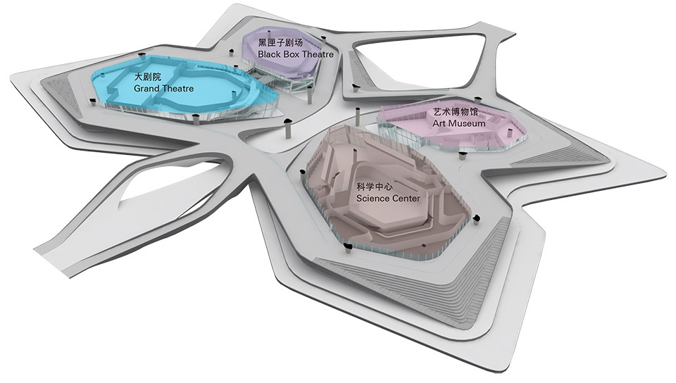 Барилга нь төв тэнхлэгийн хувьд тэгш хэмтэй бөгөөд хоёр том, хоёр жижиг хэсгээс бүтэж, дундын танхим болох үйлчилгээний төв талбайгаар хоорондоо холбогдсон байдаг. 1200 хүний суудалтай гранд урлагийн театр болон музейн хэсгийг өнгө үзэмж сайтай материалаар чимэглэсэн бол 500 хүний суудалтай олон үйлдэлт Black box театр буюу интерактив шинжлэх ухааны төвийг бараан өнгөөр бүтээсэн байна. Хэсэг бүрийн давтамж, тэгш хэм, масштабын өөрчлөлтийг тохируулан тортой ган халхавчаар хийжээ.