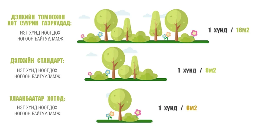 Олон улсын стандартын дагуу нэг сая хүн амтай хотод нэг хүнд 24 м.кв ногоон байгууламж ногдож байх шаардлагатай. Гэтэл манай улсад нэг хүнд 4-6 м.кв ногоон байгууламж ногдож байгаа нь дэлхийн дунджаас 6 дахин бага үзүүлэлт юм. Сүүлийн арван жилд Улаанбаатар хотын ихэнх стандарт байрны тоглоомын талбай жижиг дэлгүүр, оффисын өндөр барилга, автомашины дулаан зогсоолоор солигдчихсон. Түүнчлэн шинээр баригдаж байгаа зарим барилга, хотхонууд стандарт хэмжээнд үл нийцэх хүүхдэд эрсдэлтэй авто замтай ойр, хэт жижиг зайд, ойр ойрхон байрлалтай амралт болон тоглоомын талбай төлөвлөсөн байдал нэлээд ажиглагддаг.
