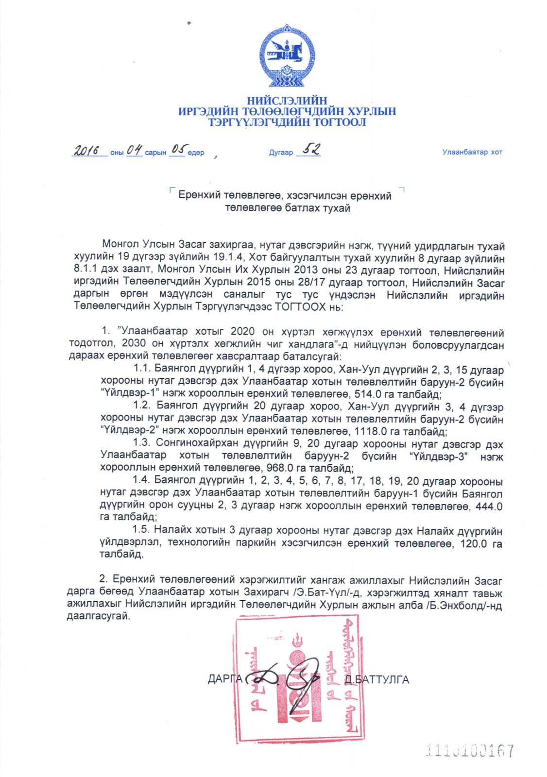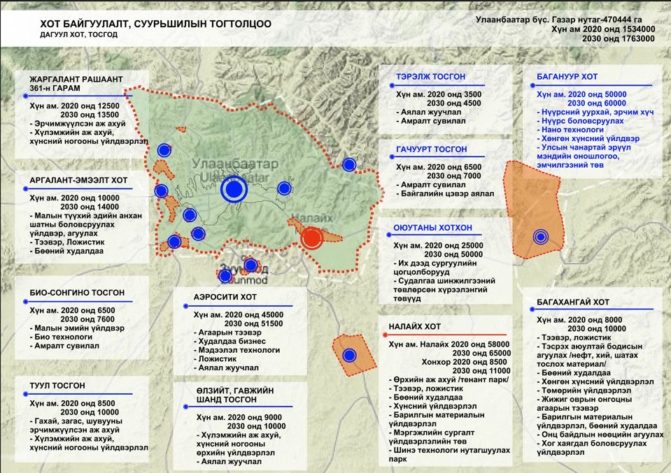 Манай хувьд “Улаанбаатар хотын ерөнхий төлөвлөгөө 2040” - ыг боловсруулан, батлуулахаар ажиллаж байна. Ерөнхий сайдын тушаалаар тус төлөвлөгөөн дээр олон улсын зөвлөх үйлчилгээ авч, дүгнэлт гаргуулахаар болсон. Тиймээс тендер зарлагдаад Солонгос Улсын зөвлөх компани шалгараад, гэрээ байгуулах шатандаа явж байна. Энэхүү төлөвлөгөөнд 100 айл, их дээд сургуулиуд, хүнд хөнгөн үйлдвэрүүд гэх мэт агаар бохирдол, хэт төвлөрлийг бий болгож буй газруудыг үе шаттай нүүлгэн шилжүүлэх, бүсчлэн хөгжүүлэх логистикийн асуудлыг тодорхой тусгасан байгаа.