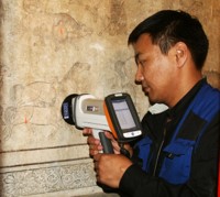 Зураг 6. Эрдэнэ зуу хийдийн Цамбын сүмийн ханын зураг, будгийн шинжилгээний хийж буй явц