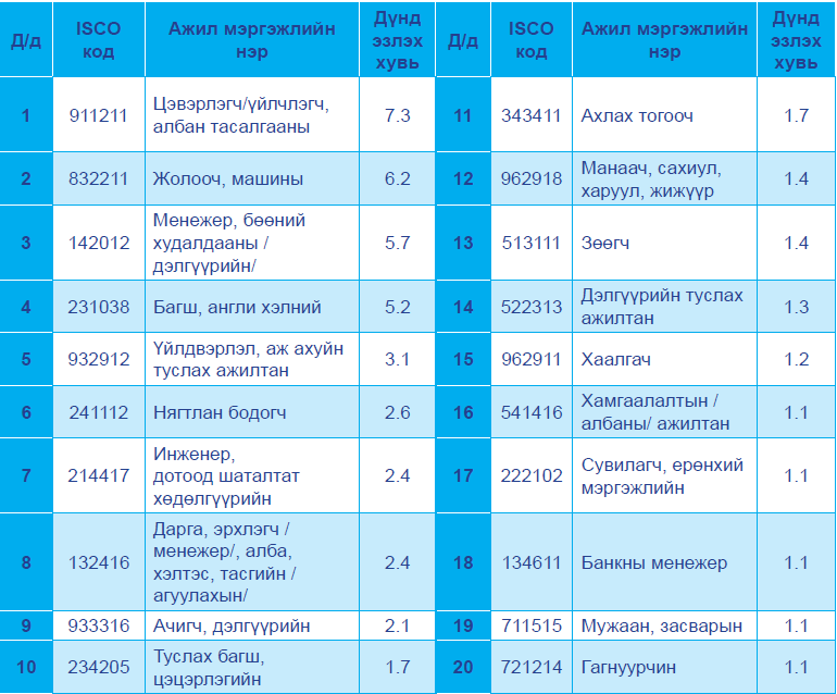 Ажил мэргэжлийн нэр | Ажилах хүчний эрэлт | Бэлтгэгдэж байгаа суралцагчдын тоо | |