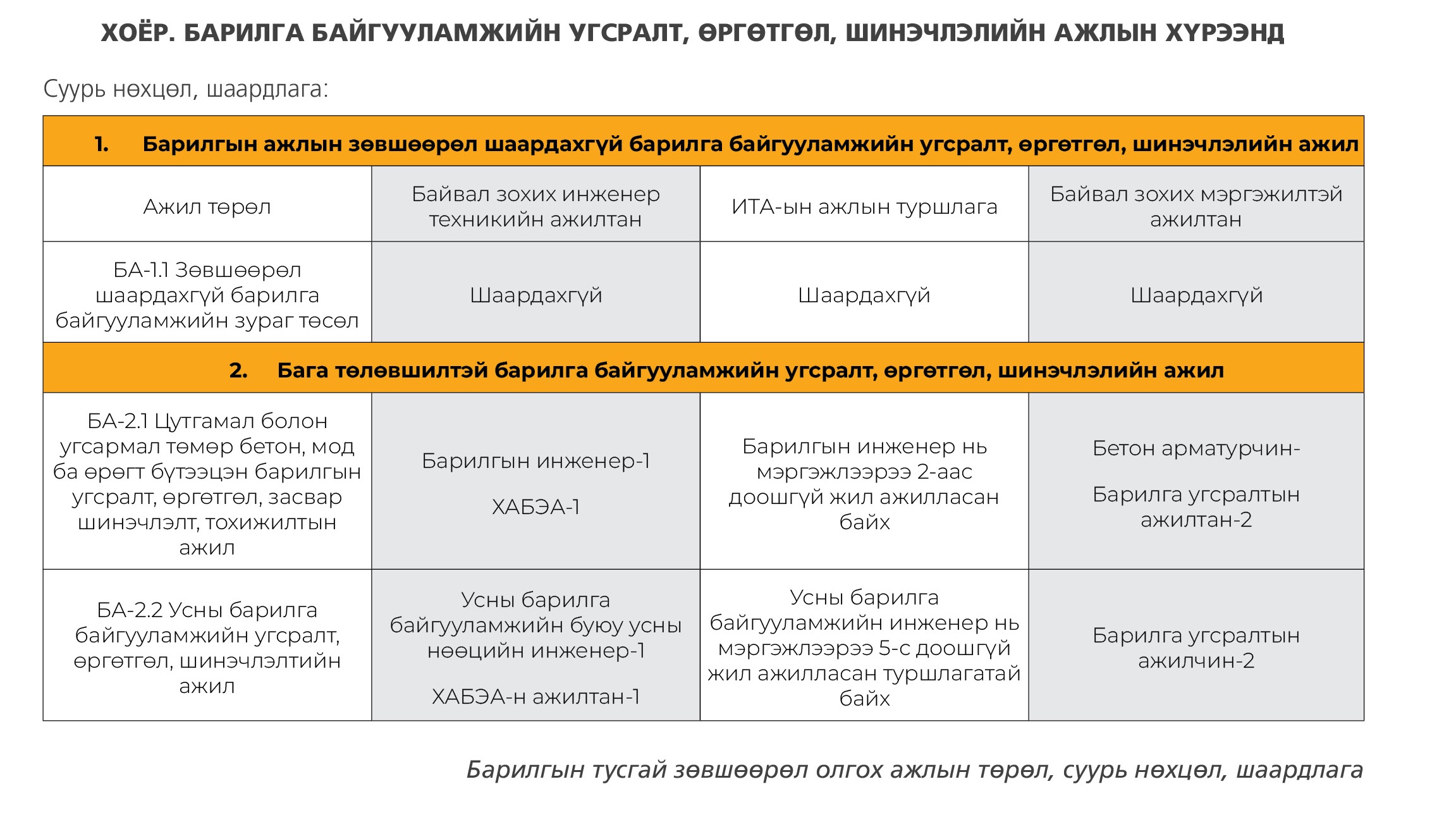 Барилга нураалтын чиглэлээр үйл ажиллагаа явуулах гэж буй бол барилгын угсралтын зөвшөөрөлтэй байх ба анхны удаа авах үед бага төвөгшилтэй барилга байгууламжийн зөвшөөрөл гардаг байна. Зөвшөөрлийн хугацаа таван жил үргэлжилнэ. Барилгын тусгай зөвшөөрөл олгох ажлын төрөл, суурь нөхцөл, шаардлага нь анх удаа зөвшөөрөл авч байгууллагад дараах байдлаар байна.