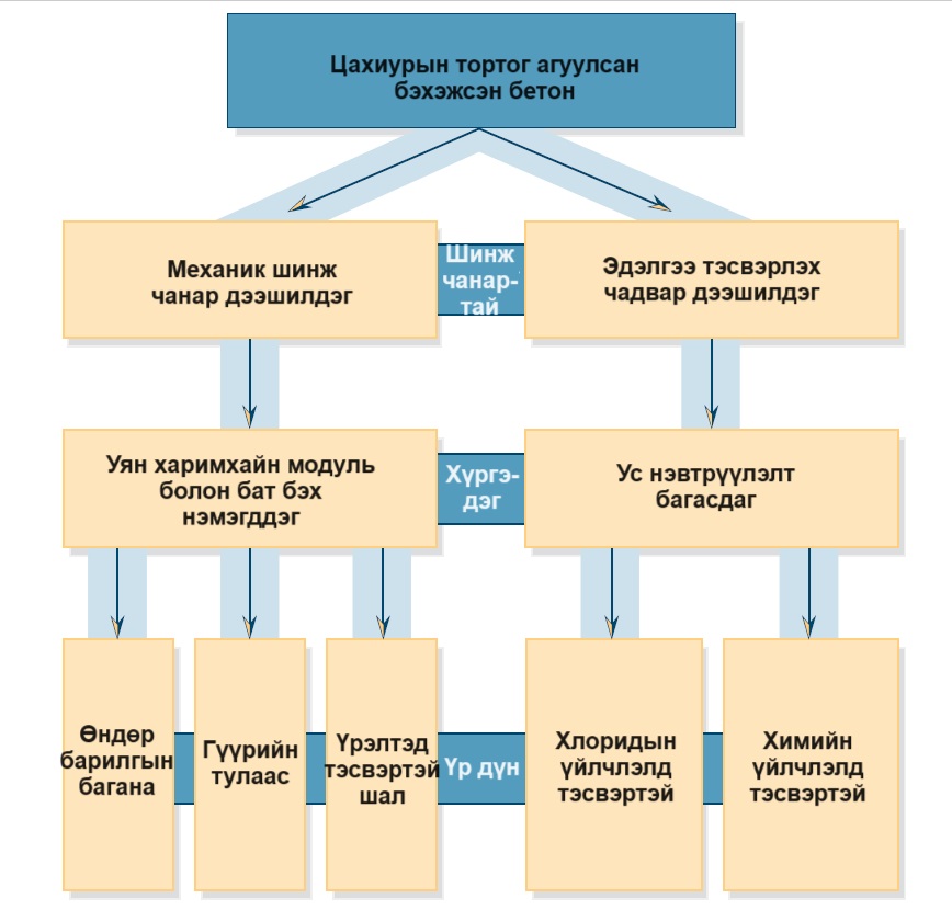 Үүнд голчлон дэгдэмхий үнс, шаарга, метакаолин, цахиурын тортог зэрэг эрдэс материалын хэрэглээг зохимжтойгоор холих мэдлэгтэй, бусад физик, механик шинж чанарын үзүүлэлтийн талаар цогц судалгаатай байхыг шаардах юм.
