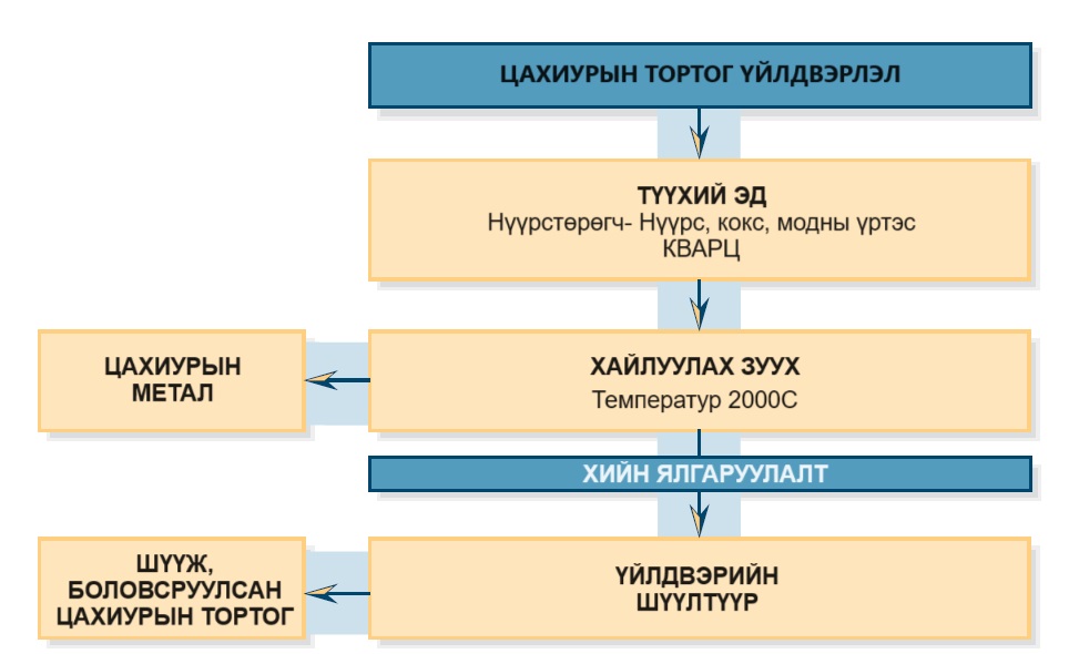 Цахиурын тортог нь цахилгаан нуман зуухны тусламжтайгаар цахиурын метал, эсвэл ферросиликон хайлш үйлдвэрлэх явцад үүссэн дайвар бүтээгдэхүүн юм. Үйлдвэрлэлийн процессыг зургаар үзүүлбэл: