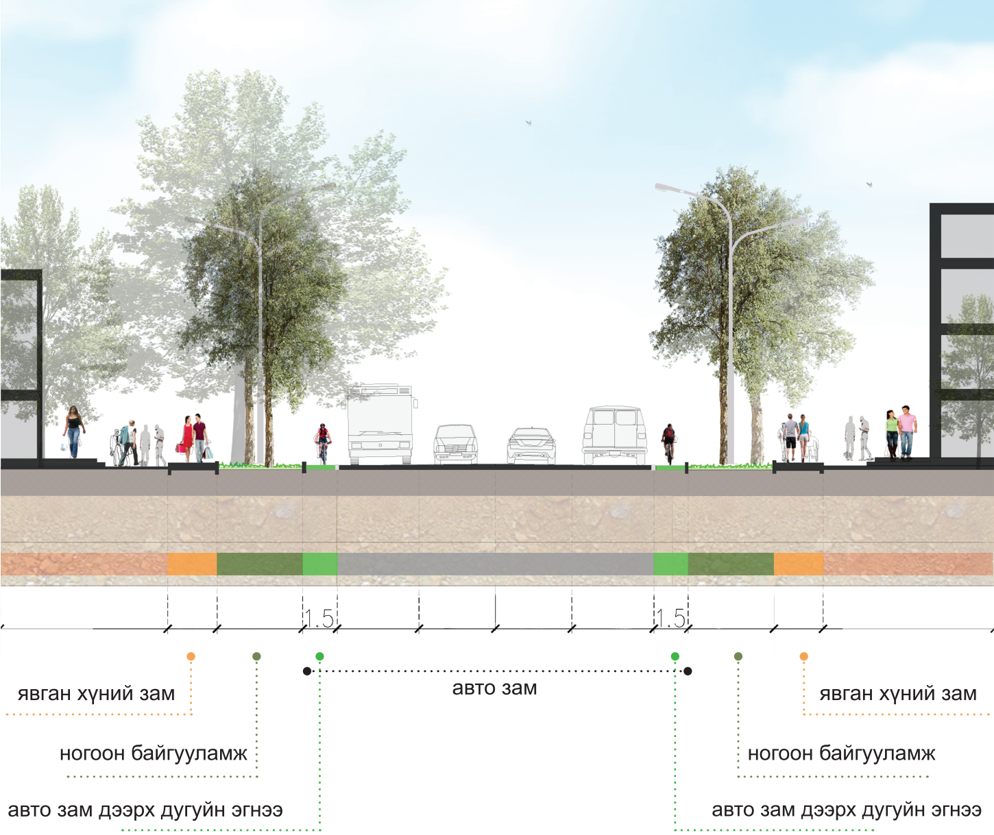 Ногоон барилгын үнэлгээний системүүдэд тавигддаг нэг гол шаардлага нь явган болон унадаг дугуйн зам, зогсоолын боломжууд байдаг. Энэ тал дээр Улаанбаатар хотын стандартууд болох иж бүрэн гудамжны UCS 0901В:2022, UCS 0903В:2022 стандартууд дээр нарийвчлан заасан байдаг.