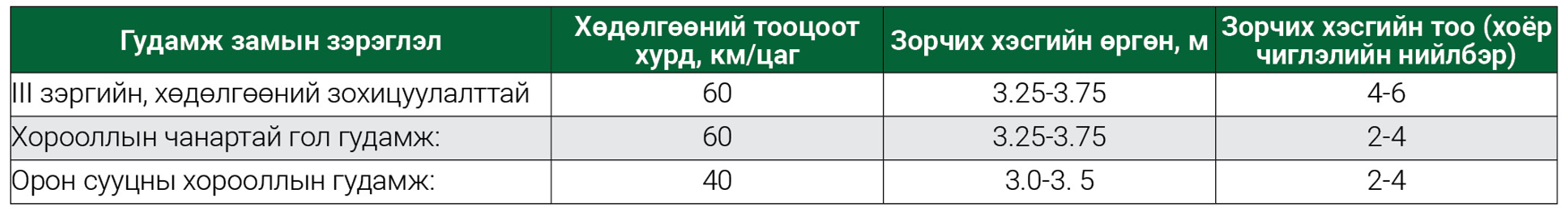 Тухайн нормд тээврийн хэрэгслийн зорчих хэсгийн өргөн болон тоог тухайлан заасан байдаг.
