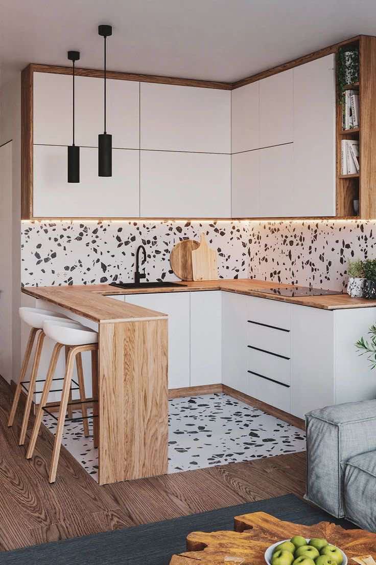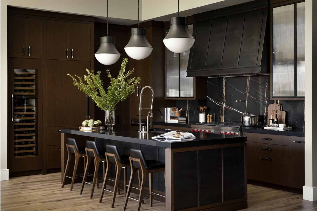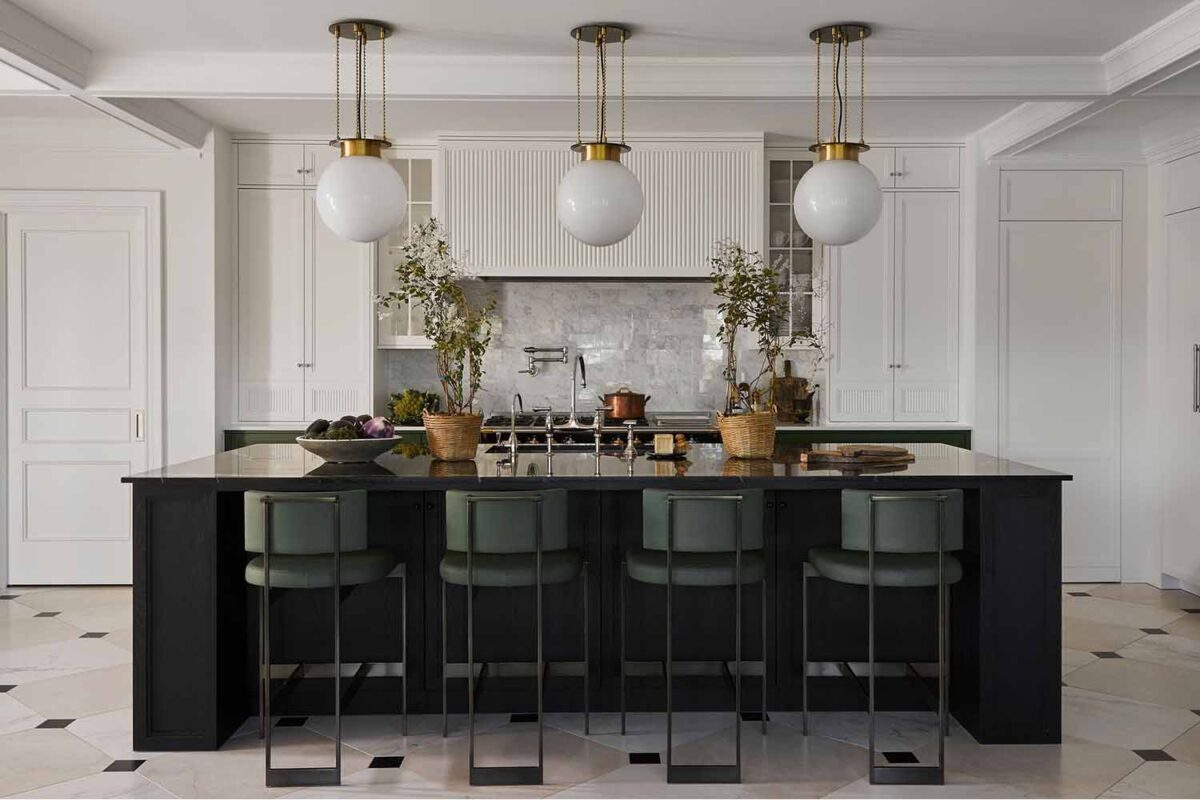 Чулуун хавтан, байгалийн гэрэлтүүлэг, гүн ногоон болон хар өнгө, метал чимэглэл хослуулсан орчин үеийн минималист гал тогооны интьерерээс сонирхуулъя.