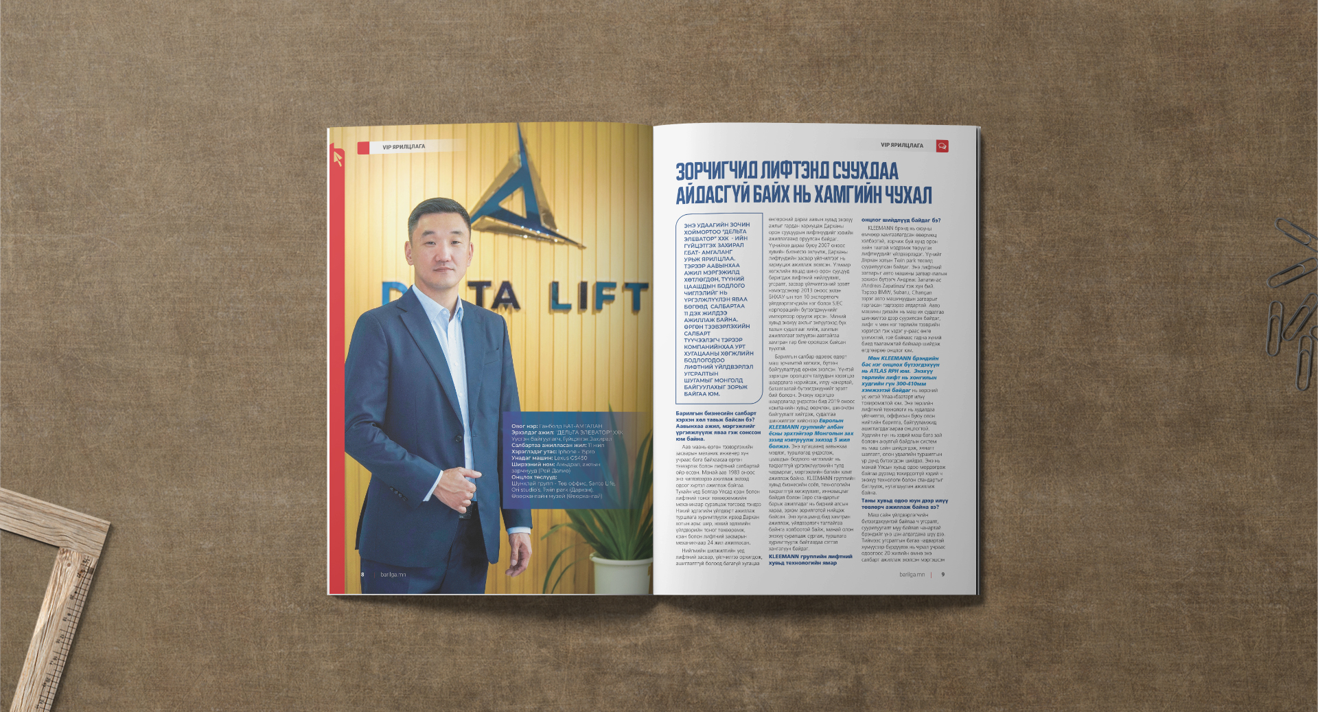 VIP ЗОЧИН: Энэ удаагийн зочны буландаа аавынхаа ажил мэргэжилд хөтлөгдөн, цаашдын бодлого үйл ажиллагааг нь өргөжүүлж яваа “Дельта элеватор” ХХК-ийн гүйцэтгэх захирал Г.Бат-Амгаланг урьж ярилцлаа. Тэрбээр салбартаа 11 жил ажиллаж буй бөгөөд өргөн тээвэрлэхийн салбарт түүчээлэгч компанийнхаа урт хугацааны бодлого, зорилтдоо лифтний үйлдвэрлэл угсралтын шугамыг эх орондоо байгуулах зорилгынхоо талаар ярьсан юм.