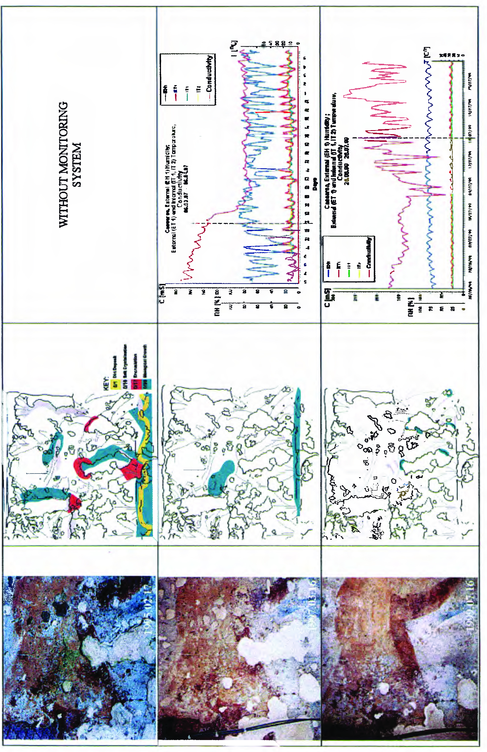 Дээрх мэт олон жишээг дурдаж болохоор байна. Түүхэн дурсгалт барилга, архитектурын дурсгалын сэргээн засварлалтын өмнөх суурь судалгааны нэг чухал алхам бол гэмтлийн зурагжуулалт юм. Энэ алхмын үед ямар төрлийн гэмтэл үүсэж буйг үндэслэлтэй, нарийн тогтоох нь зүйтэй. Зарим тохиолдолд улирлын өөрчлөлт, дотоод орчны нөлөөллөөс үүдэлтэйгээр гэмтлүүд өөрчлөгдөж байдаг. Ийм үед температур, харьцангуй чийгшил болон үнэмлэхүй чийгшлийн харилцан хамаарлын судалгаа хийж, физик, химийн өгөршлийг тогтоож, гэмтлийн шалтгааныг нарийн үнэлэх шаардлага үүсдэг. ЮНЕСКО-ийн Соёлын өвийн сэргээн засварлалт, хадгалалт хамгаалалтын судалгааны олон улсын төвөөс (ICCROM) эрхлэн гаргасан “Ханын зургийн сэргээн засварлалт, хадгалалт хамгаалалт дахь график баримтын систем” бүтээлд архитектурын дурсгалын ханын зурагт үүсэж буй гэмтэл нь дотоод орчны хамааралтай өөрчлөгдөж буйг зурагжуулж харуулжээ (Зураг 5).