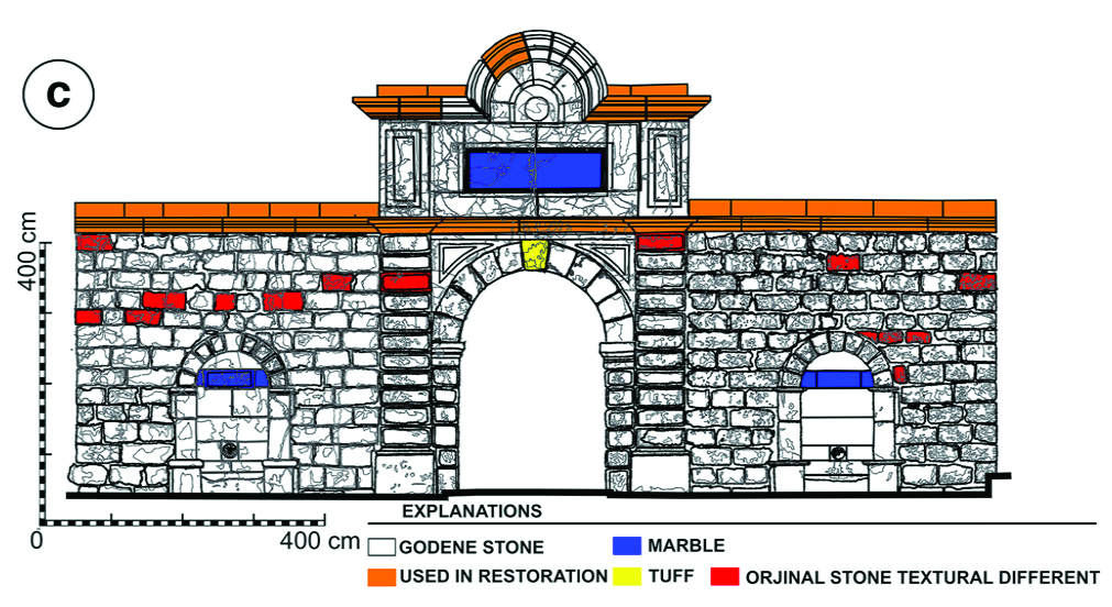 Зураг 3. Ferit Paşa Cistern уран барилгын сэргээн засварлалт хийгдсэн байдал болон үндсэн материалын өөрчлөлтийг харуулсан байдал (© İsmail İnce et al)