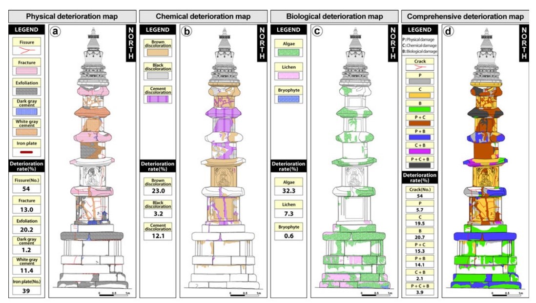 Гэмтлийн зурагжуулалтад ямар материалд, ямар гэмтлүүд үүсэж буйг ойлгомжтой, тодорхой харуулсан байх хэрэгтэй. Тухайлбал, Солонгос Улсын Магокса сүмийн 13-р зууны үеийн чулуун суварганы гэмтлийн зурагжуулалтаас тодорхой харж болно (Зураг 1). Чулуун суварганы хойд талын нүүр хэсэгт анализ хийж үзэхэд физик, хими, биологи болон даралтнаас үүсэж буй гэмтлийг тус бүрд нь задлаж өнгө ялган харуулжээ.