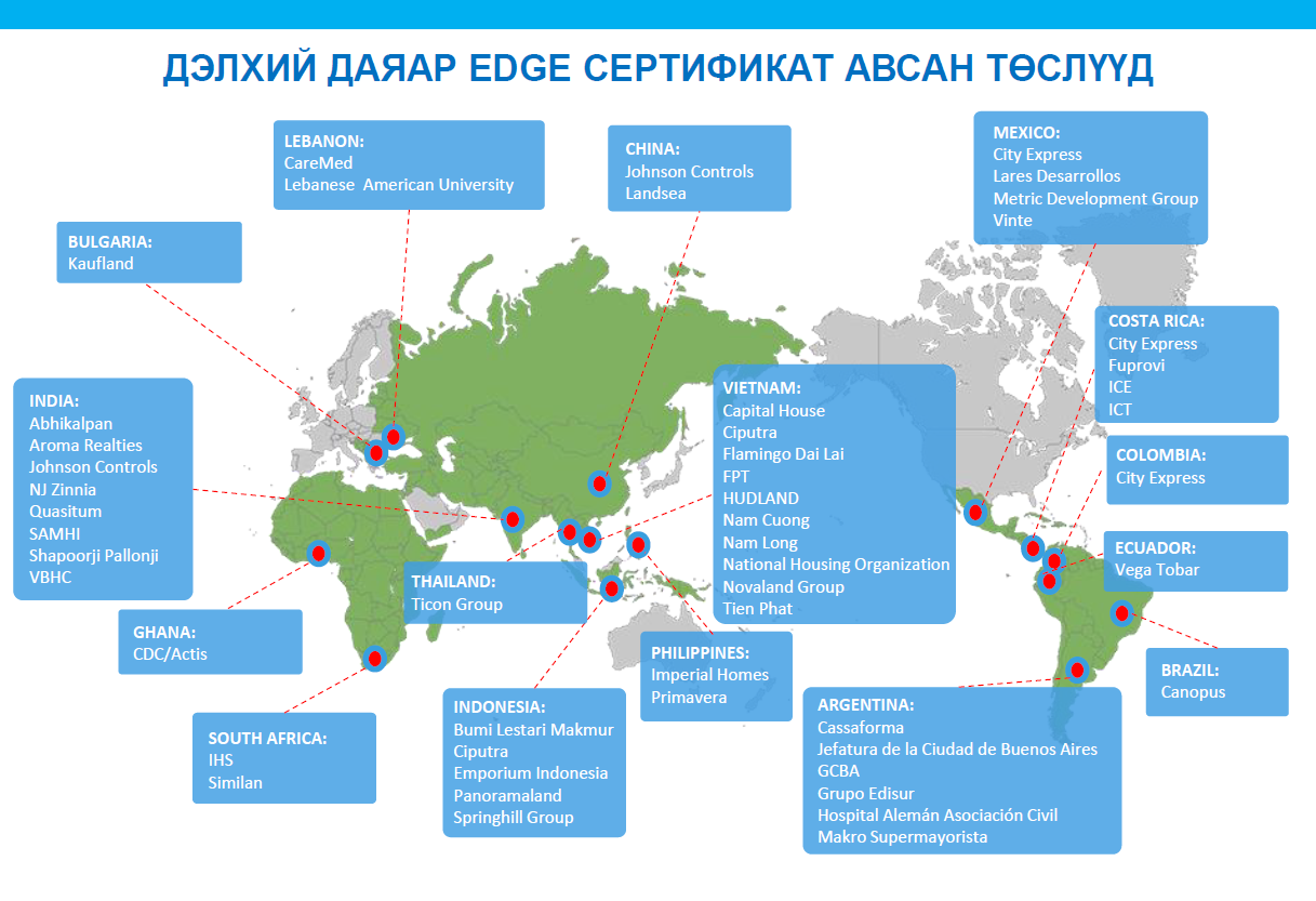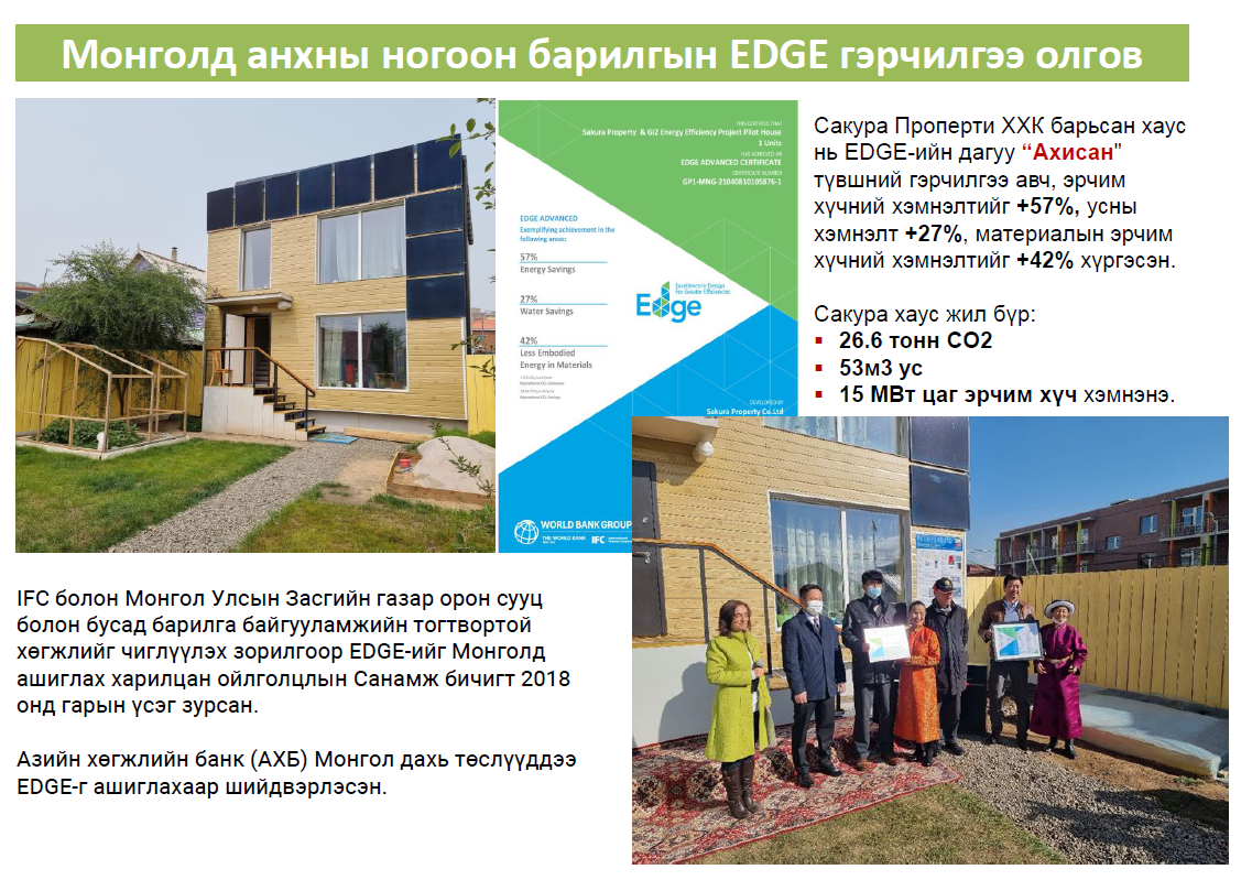 -Дэлхий дээр хүлэмжийн хий хамгийн их ялгаруулж байгаа салбар бол барилгын салбар болон эрчим хүчний салбар байгаа юм. Үүний эсрэг дэлхий нийтээр авч буй хариу арга хэмжээ нь аль болох бага эрчим хүч ашигладаг барилга барья, барилгын материалаа ч мөн эрчим хүч бага зарцуулдаг технологиор үйлдвэрлэе цаашдаа хүний эрчим хүчний хэрэглээг багасгая зэрэг хэмнэлт рүү шилжиж байна. Дэлхийн хэмжээнд уур амьсгалын өөрчлөлтийн эсрэг холбогдох байгууллагууд таванДэлхийн зах зээлд хүлэмжийн хийг бууруулсныхаа хариуд мөнгө авдаг Carbon credit system гэдэг худалдааны нэгж бий. Барилгадаа хэрэглэж байгаа эрчим хүчээ хэмнэснээр мөнгө авна гэсэн үг. EDGE систем бол үүний нэг жишээ. Нийт барилгын хэдэн хувь нь эрчим хүчээ хэмнэж байна вэ гэдгийг тодорхой шалгуурын дагуу үнэлнэ. Манай улс болон олон улсад харилцан адилгүй өөрөөр ногоон барилгын үзүүлэлтийг хэмждэг. EDGE систем нь Дэлхийн банкны гишүүн байгууллага IFC буюу Олон улсын санхүүгийн корпораци / ОУСК/- ийн бүтээгдэхүүн юм. ОУСК нь дэлхий даяар нийт 100 орчим санхүүгийн байгууллагатай хамтран ажилладаг бөгөөд 2014 оноос хойш 4,4 тэрбум долларын чиглэлээр үйл ажиллагаа явуулдгийн нэг нь Ногоон барилга юм. Үүний дагуу ногоон барилгыг байгальд хэр хэмнэлттэй вэ гэдгийг нь хэмжих систем бий болсон.