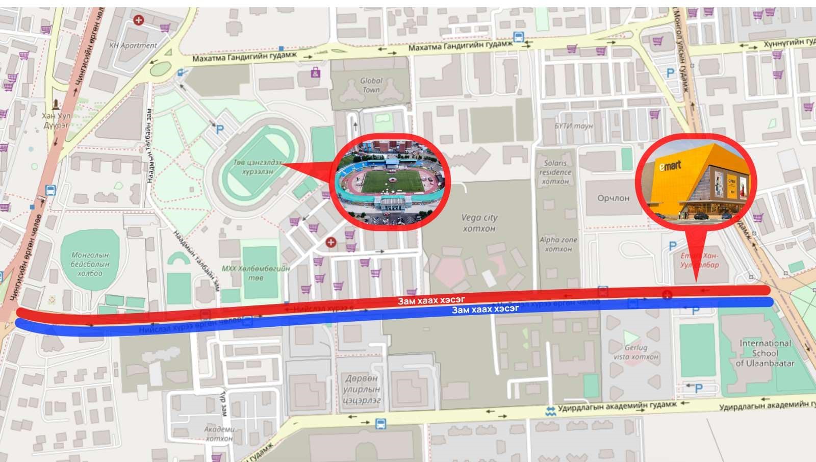 - Хан-Уул дүүрэг, 120 мянгатын уулзвараас “И-март” дэлгүүр хүртэлх авто замыг хэсэгчлэн хааж, шинэчилнэ. Хойд хэсгийн замыг 9 дүгээр сарын 24-ны өдрийн 23:00 цагаас 27-ны өдрийн 06:00 цагийн хооронд хааж, шинэчлэх бол урд хэсгийн замыг 9 дүгээр сарын 27-ны өдрийн 23:00 цагаас 29-ний өдрийн 06:00 цагийн хооронд хааж, шинэчилнэ. Иймд иргэд, жолооч та бүхэн бусад замыг сонгон хөдөлгөөнд оролцоно уу.