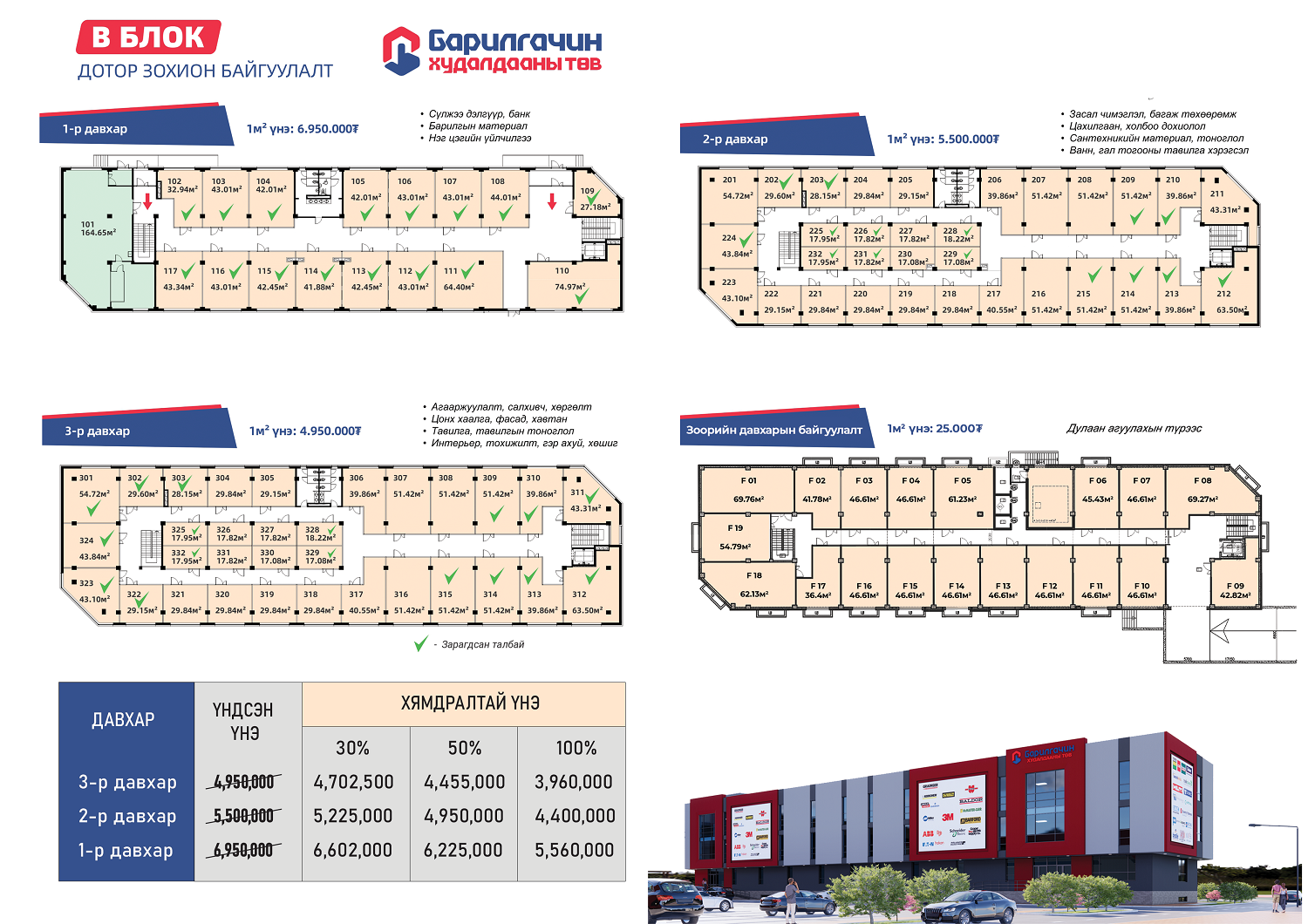 18 м2-300 м2 хэмжээтэй худалдааны талбайгаас сонгон худалдан авах боломжтой