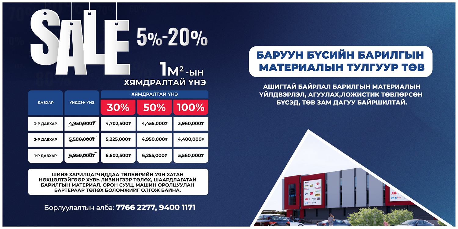 Шинэ харилцагчдадаа төлбөрийн уян хатан нөхцөлтэйгөөр хувь лизингээр төлөх, шаардлагатай барилгын материал, орон сууц, машин оролцуулан бартераар төлөх боломжийг олгож байна.