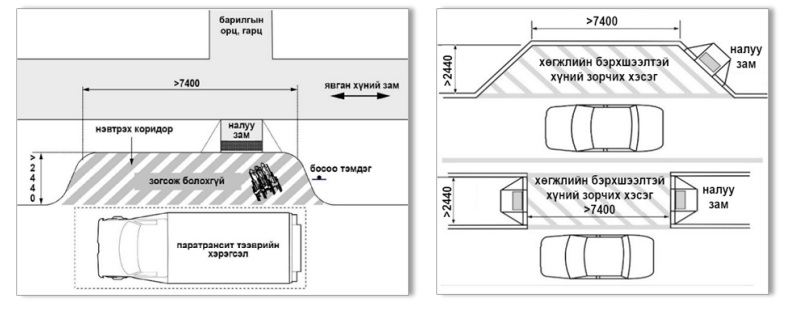 Хөгжлийн бэрхшээлтэй хүний хувийн авто тээврийн хэрэгсэл зогсох зогсоолын талбайг тусгайлан тэмдэглэж таних тэмдгээр заасан байна. Зогсоолын өргөн 3.5м-ээс багагүй байна.