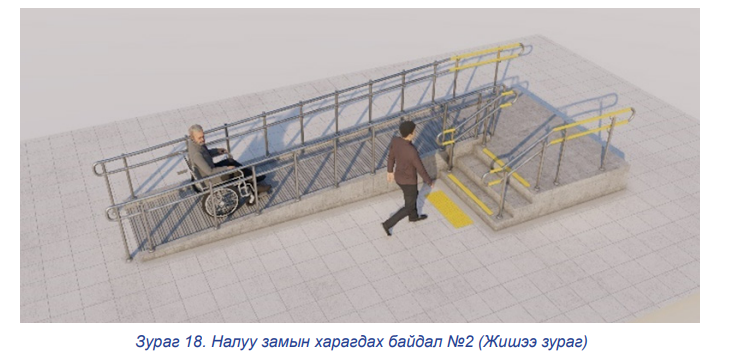 Явган хүний зам, талбайн түвшин барилга байгууламжийн шалны хоорондох уналтын зөрүү 4см-ээс их бол налуу зам эсвэл шат төлөвлөнө