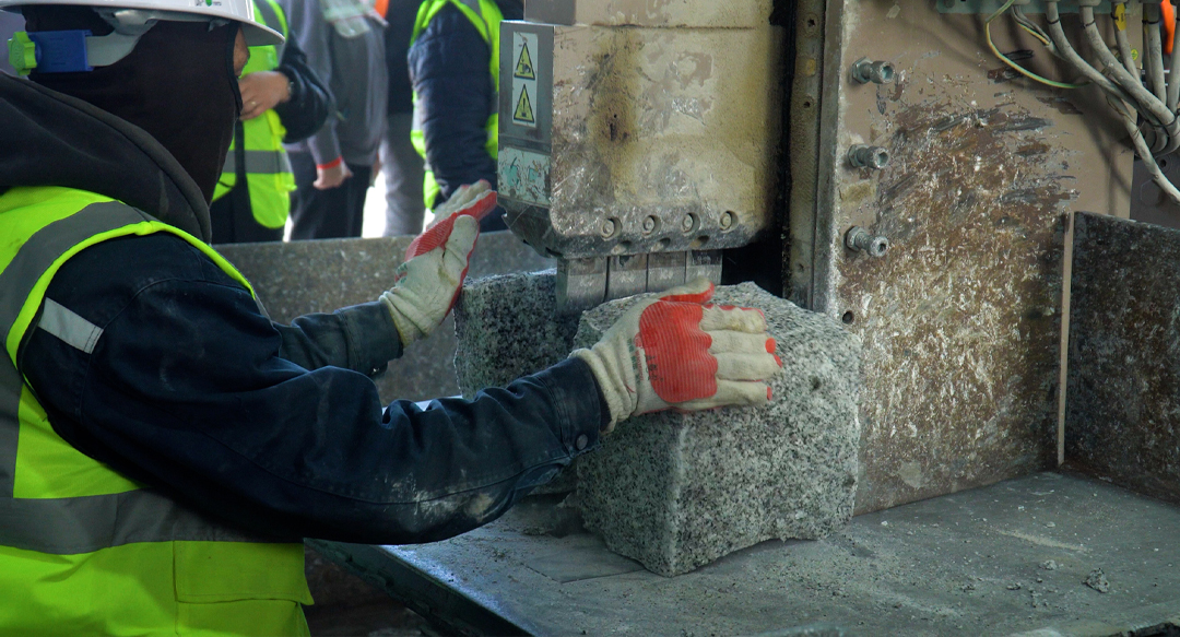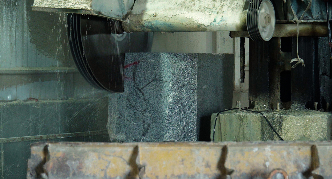 Уурхайгаас боржин чулуун блокийг автосамовалаар зөөн авчирч, 40, 50 мм зузаантай 2000*1500 мм хэмжээтэй том хавтанг бэлдэх бөгөөд уг хавтангийн гадаргууг гулгахаас сэргийлэн барзгар болгодог. Үүний дараа 600*600 хэмжээтэй хавтан үйлдвэрлэн гаргадаг байна.