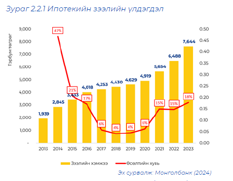 Хөтөлбөрийн зээл олгож эхэлснээр ипотекийн санхүүжилт 2017 оныг хүртэл жилд дунджаар 30 орчим хувийн өсөлттэй байсан боловч 2020 он хүртэл 4 жилийн хугацаанд 5 дахин буурч, дундаж өсөлт 5 орчим хувьтай байв. 2021 онд төрөөс авч хэрэгжүүлсэн эдийн засгийг сэргээх бодлогын хүрээнд 1 орчим тэрбум төгрөгийг орон сууцны санхүүжилтэд зарцуулснаар ипотекийн зээлийн олголт эргэн нэмэгдэж дундаж өсөлт 15 орчим хувьд хүрчээ. Хөтөлбөрийн зээл олголт буурч байсан хугацаанд банкны эх үүсвэртэй зээл олголт нэмэгдсэн ба жилийн дундаж өсөлт 20 орчим хувьд хүрчээ. Ялангуяа 2023 онд нийт ипотекийн зээлийн өрийн үлдэгдэл 7,644.0 тэрбум төгрөгт хүрснээс 31 хувь буюу 2,392.9 тэрбум төгрөгийг банкны салбарын олгосон зээл эзэлж байна. Энэ нь өнгөрсөн оноос 45 хувиар өссөн үзүүлэлт байна. (Зураг 1.2)