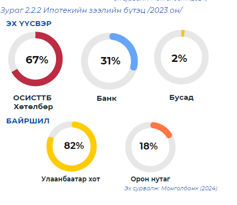 ● Монголын орон сууцны санхүүжилтийн 70 орчим хувийг төрөөс дэмжлэгтэй хөнгөлөлттэй хүүтэй хөтөлбөрийн зээл эзэлж байна. Үүнээс 80 орчим хувь нь нийслэлд төвлөрч байна.