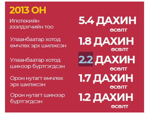 Манай улсад 2013 онд “Орон сууцны ипотекийн зээлийн санхүүжилтийн тогтвортой тогтолцоог бүрдүүлэх хөтөлбөр” (ОСИЗСТТБХ) хэрэгжиж эхэлсэн ба тухайн онд нийт 1.9 их наяд төгрөгийн ипотекийн зээлийн олгосноос 321.2 тэрбум төгрөгийг хөтөлбөрийн зээл эзэлж байжээ. (Зураг 1)