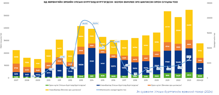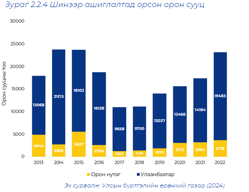 Нийслэл хотод 2007-оос 2024 оны 2-р улирал хүртэлх хугацаанд эд хөрөнгийн эрхийн улсын бүртгэлд өмчлөх эрх шилжсэн 334,216 орон сууц байгаагаас дийлэнх буюу 75 хувь нь Улаанбаатар хотоос, үлдсэн 25 хувь орон нутгаас бүрджээ. 2024 оны 2-р улирлын байдлаар нийслэлд 11,712 орон сууц, орон нутагт 3,939 орон сууцны өмчлөх эрх шилжсэн буюу орон нутагт орон сууцны нийлүүлэлт өсөх хандлагатай байна. 2013 оноос хойш улсын хэмжээнд нийт 176907 орон сууц шинээр ашиглалтад орсноос 145829 буюу 82.4%-ийг Улаанбаатар хотод, үлдсэн 17.6 хувь нь хөдөө орон нутагт ашиглалтад оржээ. (Зураг 2.2)