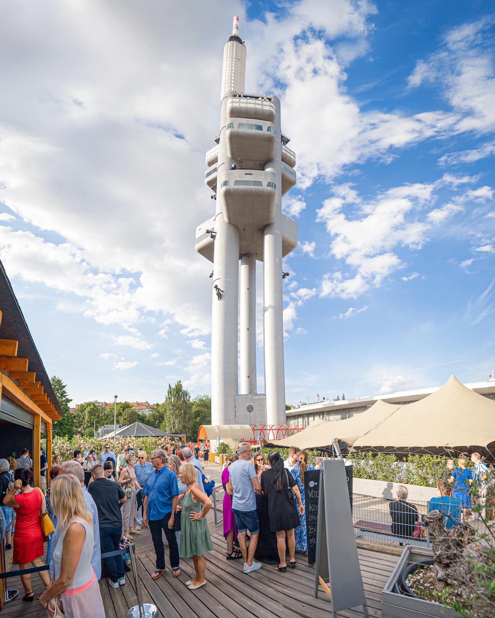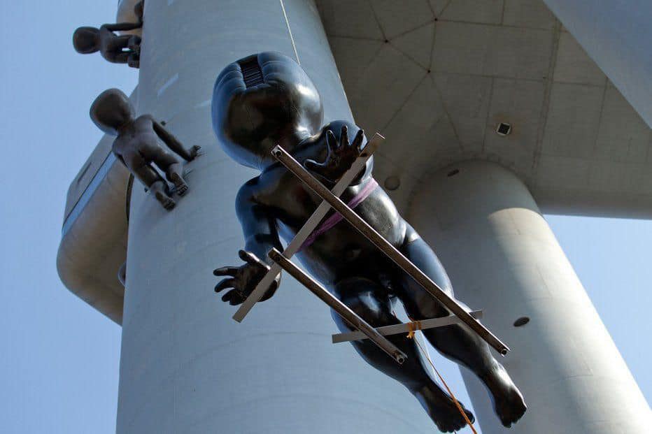 216 метр өндөр уг цамхаг өөд, уруу мөлхөх бяцхан хүүхдүүдийн хөшөөг 2000 онд цамхагт “өнгө үзэмж, утга агуулга нэмэх” зорилготойгоор нэмж хийсэн байдаг боловч Праг хотын иргэд дургүйцлээ илэрхийлснээр хүүхдүүдийн хөшөөг цавчин буулгасан байдаг. Гэтэл 2019 онд хүүхдүүдийн хөшөөг хуучин хэвээр нь байршуулсан бөгөөд хөшөөнүүдийн нарийн учир агуулга нь ойлгомжгүй хэвээр өнөөдрийг хүрч байна.
