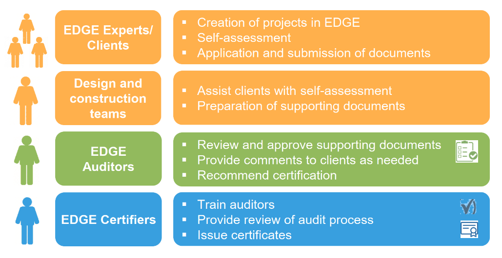 EDGE гэрчилгээ авах хүсэлтийг EDGE Expert эсхүл захиалагч боловсруулж, EDGE Auditor баталгаажуулж, EDGE Partner гэрчилгээжүүлдэг. EDGE Expert бол үл хөдлөх хөрөнгийн төсөл хөгжүүлэгч, үл хөдлөх хөрөнгийн эзэн, болон төслийн баг зэрэгт edge стандарт, программ хангамж, гэрчилгээжүүлэлтийн тогтолцоо зэргийг ойлгоход дэмжлэг үзүүлдэг мэргэжилтэн юм.