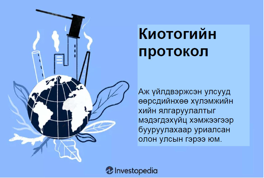 Хоёр. Киотогийн протокол: Аж үйлдвэрийн хувьсгал (1790-1850) эхэлсэн цагаас хойш агаар мандал дахь нүүрстөрөгчийн давхар ислийн агууламж 35 хувиар ихэссэн нь дэлхийн дундаж температур хурдтайгаар нэмэгдэхэд хүргэсэн. Уур амьсгалын энэхүү өөрчлөлтийн гол шалтгаан нь өндөр хөгжилтэй орнуудын хүлэмжийн хийн ялгаруулалт аж. Энэ протоколын гол зорилго нь агаар мандалд их хэмжээний хүлэмжийн хий ялгаруулдаг, өндөр хөгжилтэй улс орнуудад 2012 он гэхэд 1990 онд байсан хүлэмжийн хийн ялгарлын хэмжээг дунджаар 5.2 хувиар бууруулах үүрэг хүлээлгэсэн. Анхны бичиг баримт Киотогийн протокол 1998 оны гуравдугаар сард гарын үсэг зурсан, 2005 оны хоёрдугаар сарын 16 нд хүчин төгөлдөр болсон.