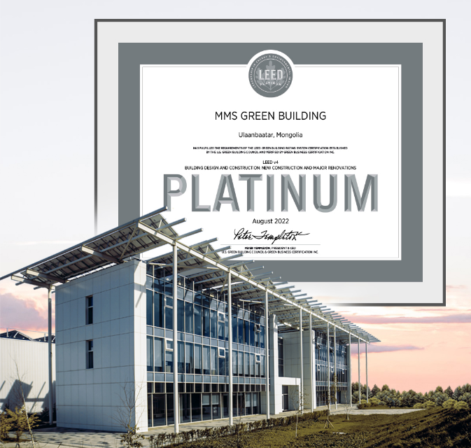 Барилгад LEED гэрчилгээ авах боломжийн тухайд судалж үзвэл дараах үр дүн гарна. Монгол Улсад ногоон барилгын LEED PLATINUM гэрчилгээ авсан анхны бөгөөд цорын ганц барилга бол MMS Green Building. Монгол Улсад LEED PLATINUM гэрчилгээ авсан анхны бөгөөд цорын ганц барилгад гэрчилгээжүүлэлт олгосон байгууллага бол БНХАУ-ын Шанхай хотод байрлалтай BEE юм. Тус барилгын хувьд энгийн барилгын өртөгтэй харьцуулж үзвэл 35 орчим хувийн илүү ашиглалтын явцад энэхүү барилга шиг хэмжээтэй энгийн барилгын сарын зардал нь 20-30 сая бол тус барилга 10 сая төгрөгийн зардалтай. Батарей суурьтай 360 ширхэг нарны панел ашигласан. Өөрийн цахилгаан хэрэгцээг 100% сэргээгдэх эрчим хүчээр хангаж, нарны цахилгаан эрчим хүчний үүсгүүрийн хосолмол буюу (hybrid) системтэй бөгөөд нийт 168 кВт цахилгаан эрчим хүч үйлдвэрлэж, 100 киловаттын баттарейд хуримтлуулан, илүүдэл эрчим хүчээ төвийн нэгдсэн сүлжээнд нийлүүлдэг. Оффис эзэнгүй байх амралтын өдрүүдээр барилга өөрийн эрчим хүчний хэрэглээгээ унтаа горимд оруулдаг. Ус, дулааны хувьд төвийн шугамд холбогдсон, хосолмол системтэй дулааны үр ашигтай шийдлүүд нэвтрүүлсний ачаар жирийн барилгатай харьцуулахад хэрэглэх байсан дулааны ердөө 30 орчим хувийг эзэлж байгаа.