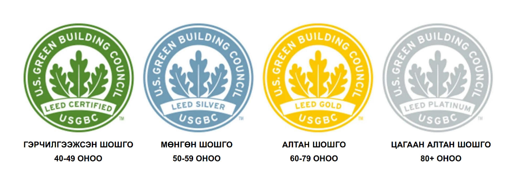 Тав. LEED үнэлгээний систем: АНУ-ын Ногоон барилгын зөвлөл 1993 онд үүсгэн байгуулагдсан ба 1994 оноос эхлэн LEED барилгын үнэлгээний тогтолцоог шинээр баригдаж буй барилга, байгууламжуудад зориулан боловсруулж, туршилтаар хэрэглэж эхэлсэн. 1998 онд албан ёсны үнэлгээний тогтолцоо болгон хэрэглэсэн. 1998 онд v1.0, 2005 онд v2.0 хувилбарт ажиллагаанд суурилсан төсөллөлтийг нэмж, 2009 онд v3.0 хувилбарт дөрвөн зэрэглэлийн шошго нэмж, 2013 онд v4.0 хувилбарт дуу чимээний тав тухтай байдал, дотор агаарын чанарын шаардлага зэргийг нэмж тус тус сайжруулсан бол 2025 оны эхээр илүү нэмж сайжруулан v5.0 хувилбарыг зах зээлд нэвтрүүлэх аж. LEED гэж Leadership Energy and Environmental Design буюу Барилгын Эрчим Хүч Ба Хүрээлэн Буй Орчны Манлайлагч Төлөвлөлт гэх үгсийн товчлол юм.