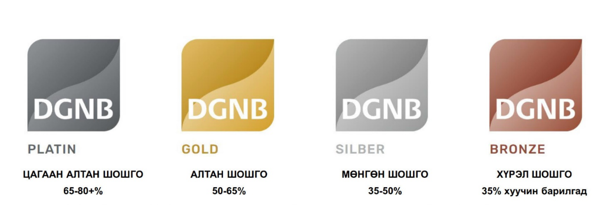Зургаа. DGNB үнэлгээний систем: ХБНГУ-ын Тогтвортой барилгын зөвлөлийг 2007 онд барилга угсралтын болон үл хөдлөх эд хөрөнгийн салбарын 16 байгууллага хамтран үүсгэн байгуулсан. Экологи, эдийн засаг, нийгэм соёл, техник, барилга угсралт, байршил зэрэг зургаан шалгуурын шаардлага хангасан барилгуудад хүрэл, мөнгө, алтан, цагаан алтан медалиар шагнадаг. 2015 оны 9 сард шагналын бодлогодоо өөрчлөлт хийж. Хамгийн дээд шагналаар цагаан алтан медаль буюу 80 хувиас дээш гэж сайжруулалт хийсэн. Улмаар хүрэл медаль бол зөвхөн хуучин барилгуудад олгодог болжээ.