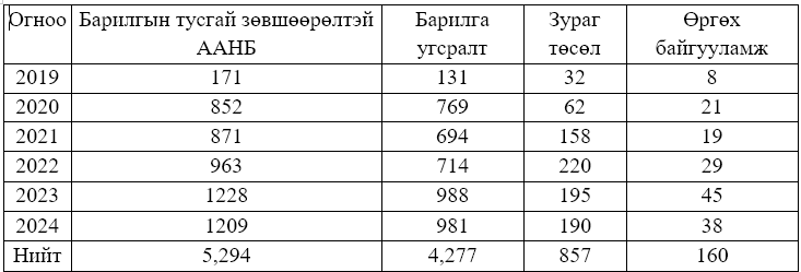 2024.10.31-ний өдрийн байдлаар Барилгын үйл ажиллагааны тусгай зөвшөөрөлтэй 5294 аж ахуй нэгж байгууллага үйл ажиллагаа явуулж байна. Барилга, байгууламжийн зураг төсөл боловсруулах, барилгын ажил гүйцэтгэх, өргөх байгууламж, түүний эд ангийн үйлдвэрлэл, угсралт, засвар үйлчилгээ эрхлэх тусгай зөвшөөрөл”-ийг шинээр авах, нэмэлт ажлын төрөл авах, сунгуулсан тухай тодорхойлолт хүссэн 564 хүсэлт, өргөдөл гомдлыг бүртгэн хүлээж авсан. Үүнээс тодорхойлолт хүссэн 282, мэдээлэл хүргүүлэх тухай болон бусад төрлөөр 282 албан бичиг ирсэн байна.