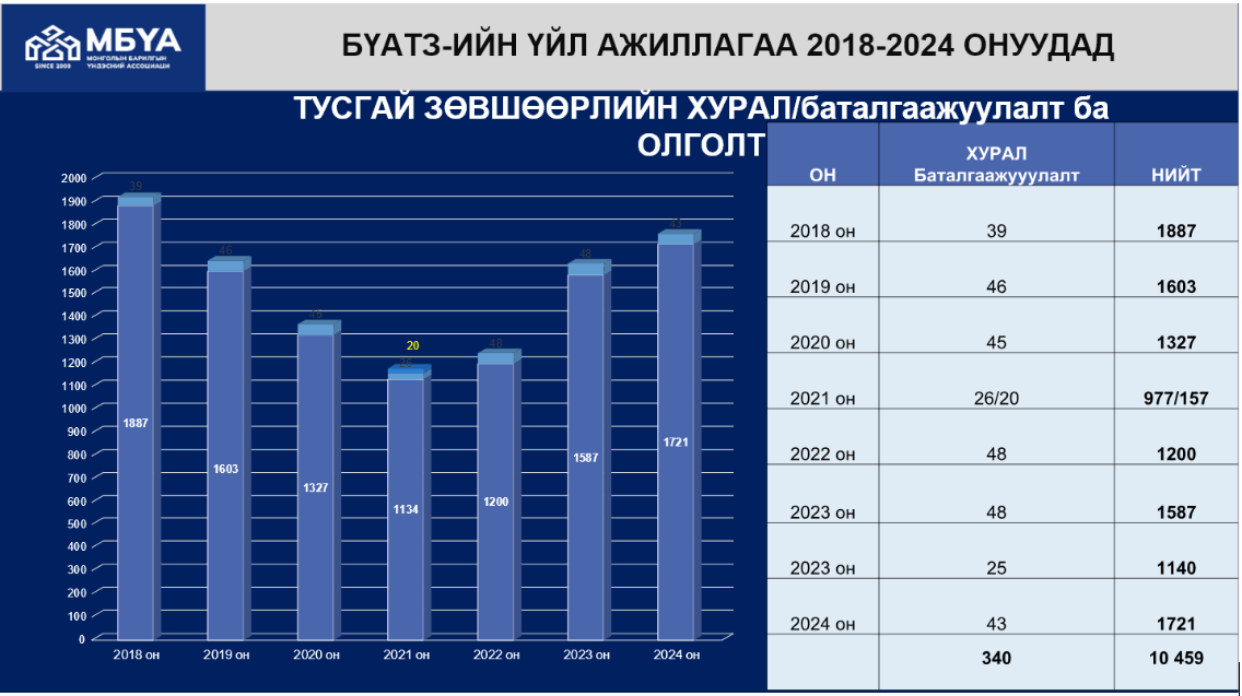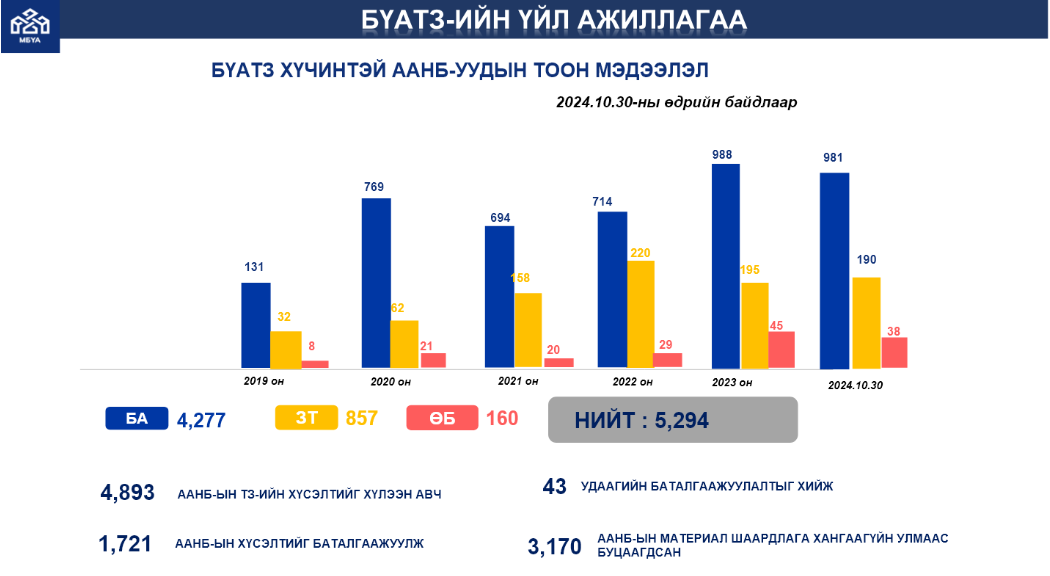 2024.10.30-ны өдрийн байдлаар 43 удаагийн баталгаажуулалтаар БҮАТЗ хүссэн нийт 1721 ААНБ-ын өргөдөл материал хянаж, баталгаажуулалт хийснээс сунгасан 86, шинээр 1143, нэмэлтээр 468, дахин 24 ААНБ-д БҮАТЗ олгов. Эдгээр 43 удаагийн баталгаажуулалтаар давхардсан тоогоор 3170 ААНБ-ын материалыг шаардлага хангаагүй учраас буцаав. Хаяж, үрэгдүүлсэн болон бусад шалтгаанаар 24 ААНБ-д БҮАТЗ олгосноос, барилга угсралтаар 20, зураг төсөл боловсруулахаар 3, өргөх байгууламжаар 1 аж ахуй нэгж байгууллага тус тус байна.