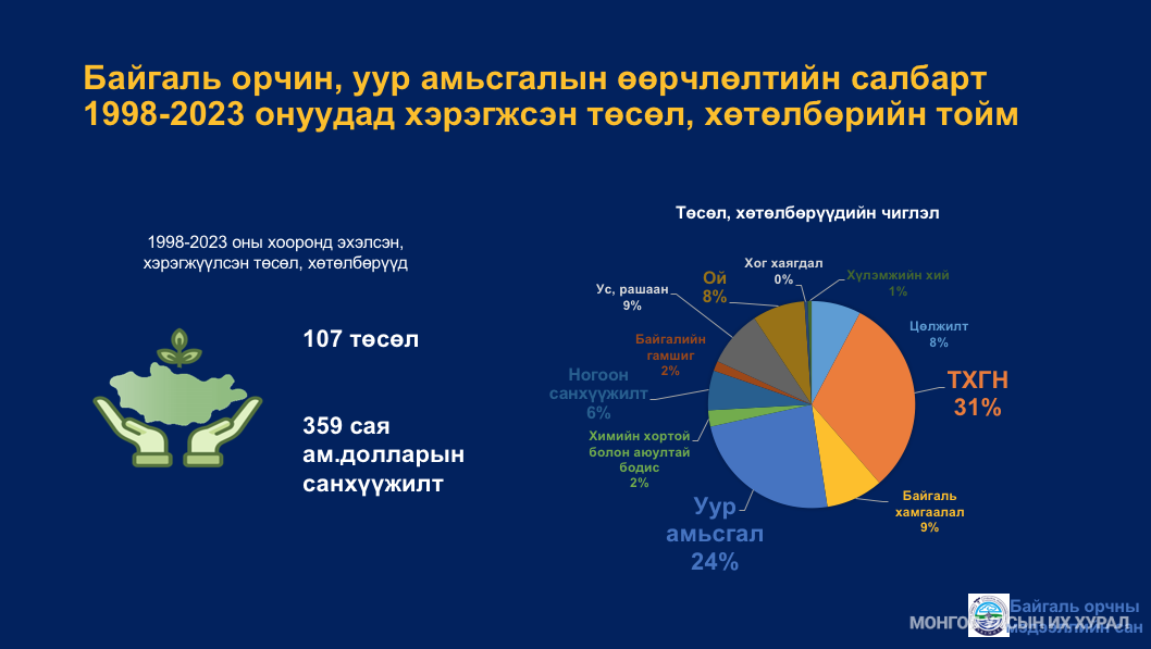 Байгаль орчин, уур амьсгалын салбарт 2024 оны байдлаар нийт 182.4 сая ам.долларын санхүүжилттэй 28 төсөл хөтөлбөр хэрэгжиж байгааг Байгаль орчин, уур амьсгал өөрчлөлтийн яамнаас мэдээллээ. Харин сүүлийн 25 жилийн хугацаанд нийт 360 орчим сая ам.долларын төсөл хөтөлбөр хэрэгжүүлсэн байна. Үүнийг өнөөдрийн ханшаар тооцвол 1.2 их наяд гаруй төгрөг болж байгаа аж.