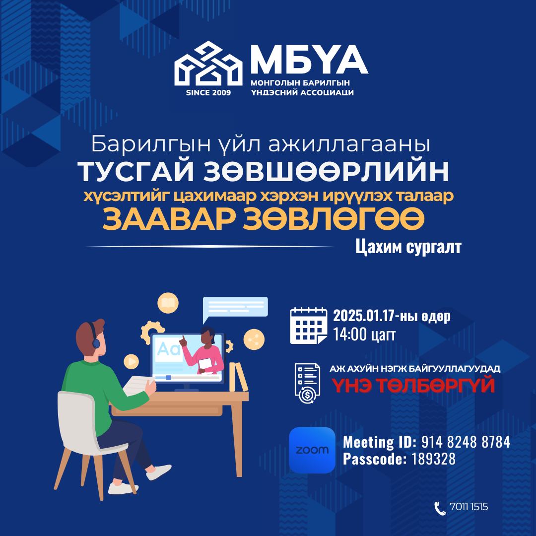 Барилгын үйл ажиллагааны тусгай зөвшөөрлийн хүсэлтийг цахимаар хэрхэн ирүүлэх талаар заавар зөвлөгөө цахим сургалтад ААНБ-уудыг урьж байна.