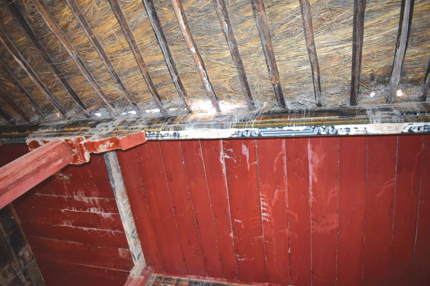 Сүмийн үүдний саравчны хээ чимэглэлийн будаг, суурь давхарга, маажин, зүмбэр нь нар, салхи, хур тунадасны нөлөөгөөр бүдгэрч алга болсон.