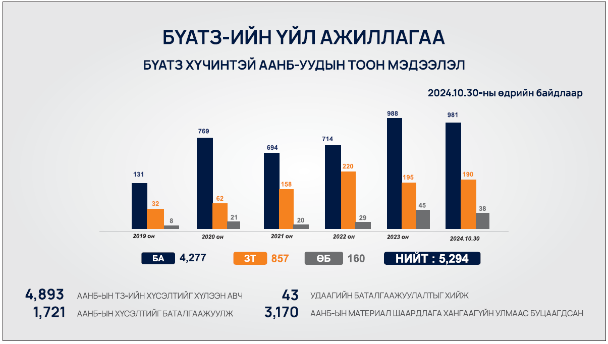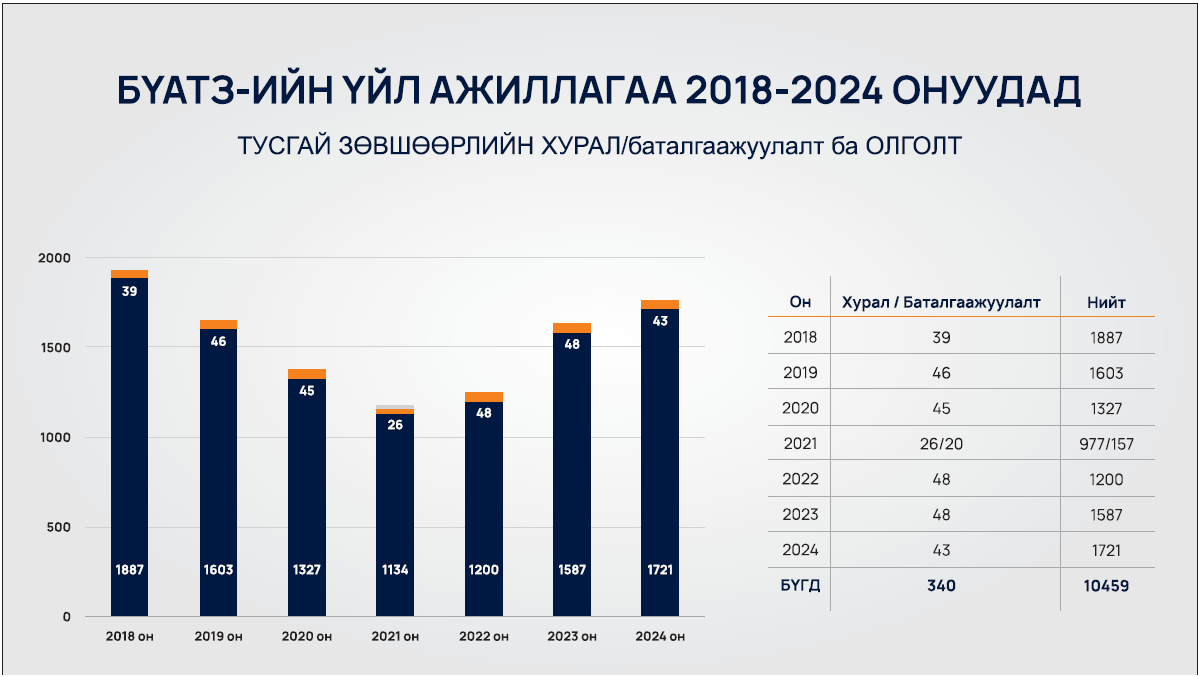 2024 оны 10 сарын 30 - ны байдлаар нийт 5294 ААН - ийн тусгай зөвшөөрлийн хүсэлт ирсэн бөгөөд үүнээс 1721 хүсэлтийг баталгаажуулан, 3170 ААНБ шаардлага хангаагүйн улмаас буцаагдсан байна.