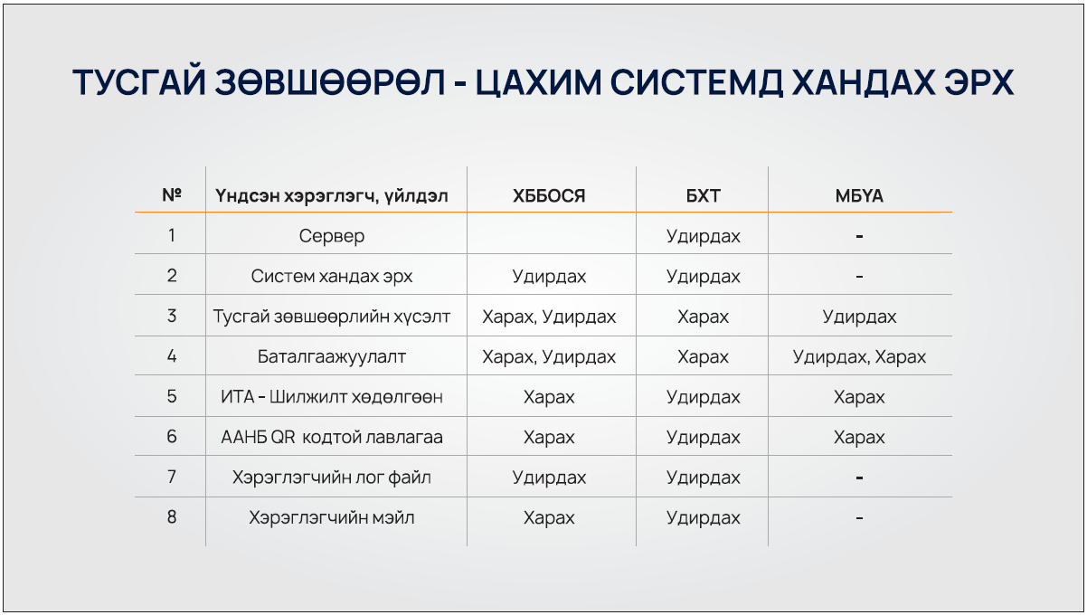 МБҮА - д тусгай зөвшөөрөл олгох эрхийг шилжүүлсэн боловч серверийг удирдах, хандах гэх мэт бүхий л эрх Барилгын Хөгжлийн төвд байна. Үйл ажиллагааны тайлан болон ИТА шилжилт хөдөлгөөн нь БХТөв дээр бүртгэгддэг ба тухайн этгээд давхар очих шаардлагатай болдог. Харин Хот Байгуулалт, Барилга, Орон Сууцжуулалтын яаманд зарим системийг удирдах болон хандах эрх байдаг бол МБҮА - д тусгай зөвшөөрлийн хүсэлтийг удирлах, баталгаажуулах эрхтэй байдаг байна.
